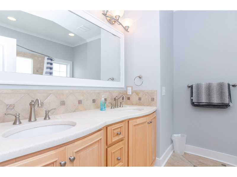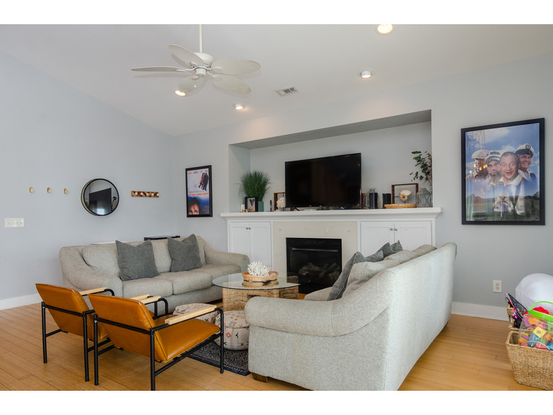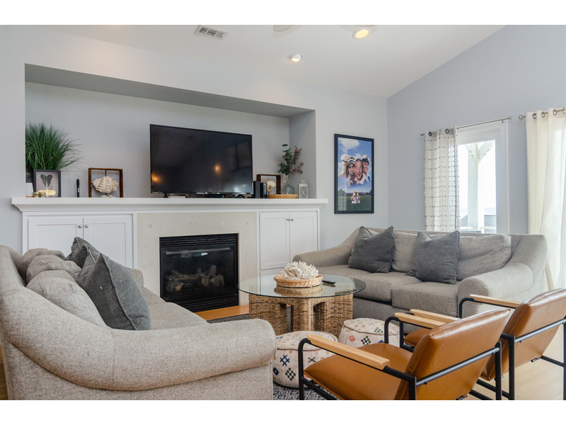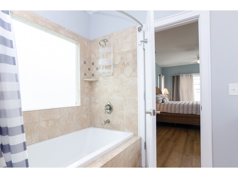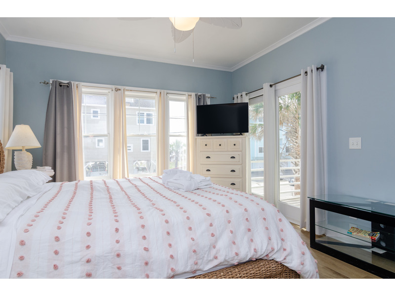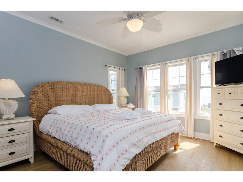 The primary bedroom is located on the first floor. With a King size bed, two closets, a beautiful en suite with double vanities and a garden tub, this room is a real retreat. A large deck across the front of the home is shared between the primary and the second bedroom. The second bedroom has a Queen bed and a Jack-and-Jill bathroom that connects to the third bedroom. The third bedroom has a Queen bed and features a private, stand-up deck perfect for enjoying the salt air. Bedroom four is also on this level and has a day bed with a trundle. The laundry area with stackable washer and dryer is located on this floor.