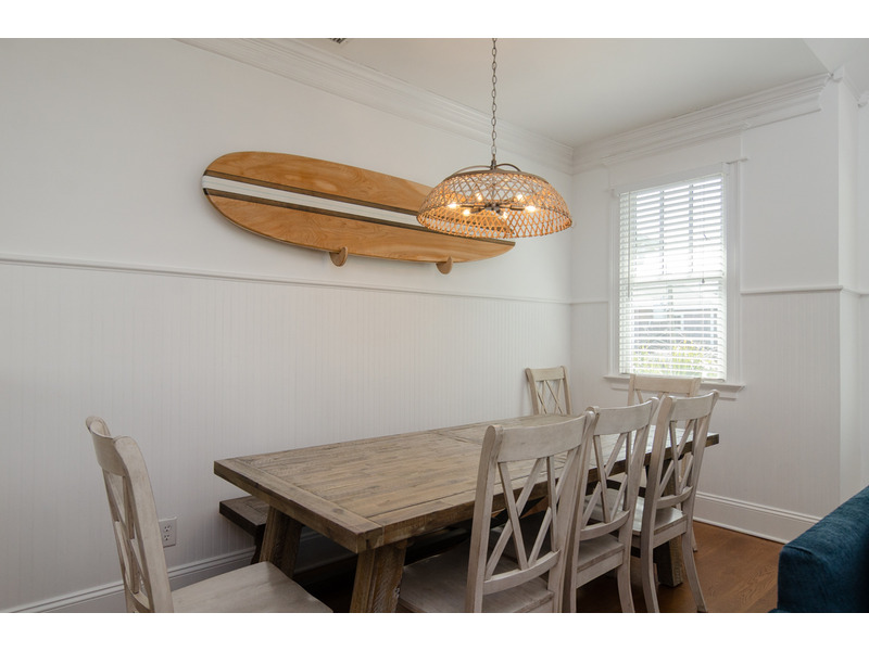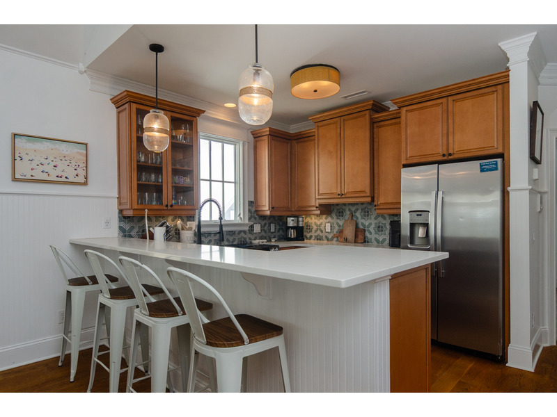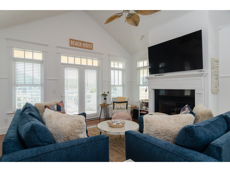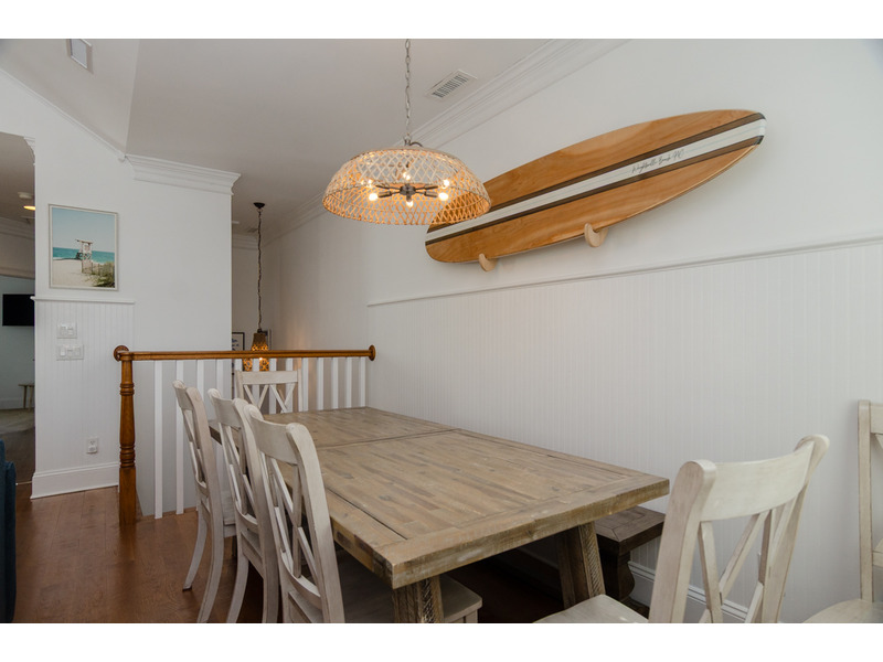 Upstairs the spacious and attractively decorated open concept living area has vaulted ceilings, deck with ocean views, and great family room. Enjoy your morning coffee or escape the afternoon sun on the covered porch off the living area. The living room features a 70" Saumsung smart TV and is a great place for gathering the family or to relax after a fun filled day on the beach. The kitchen was recently renovated and leaves nothing to be desired! Complete with all new granite counter tops, custom tile back splash, stainless steel appliances, and bar seating for 4 people - this kitchen truly is the heart of the home! A rustic kitchen table with bench seats 8, and flows into the living room and kitchen. There is also a guest bedroom with a queen bed, 43" smart TV, and a balcony that overlooks the water. A full bathroom off the main living area services this bedroom as well as guests and visitors.