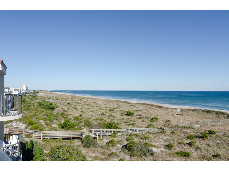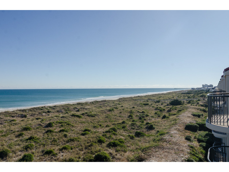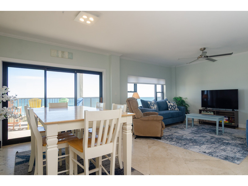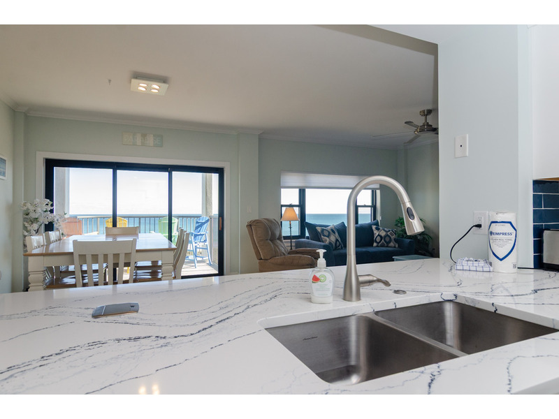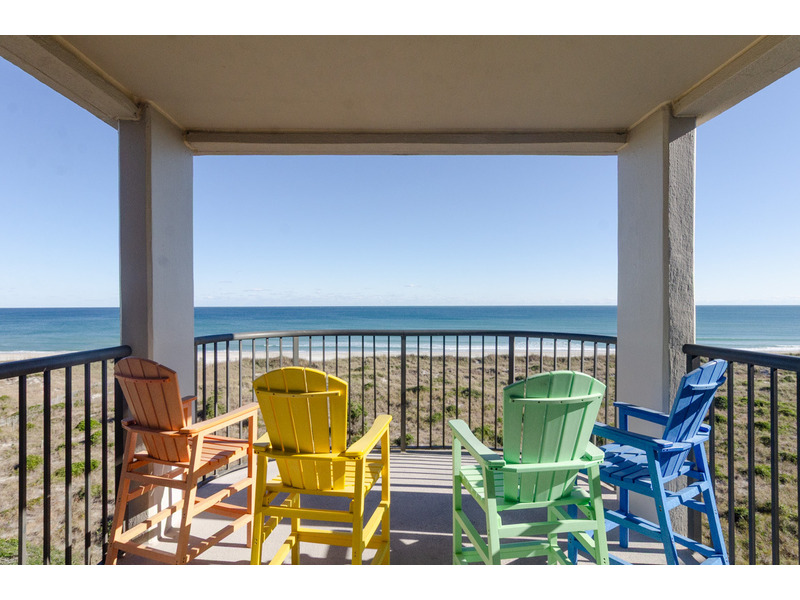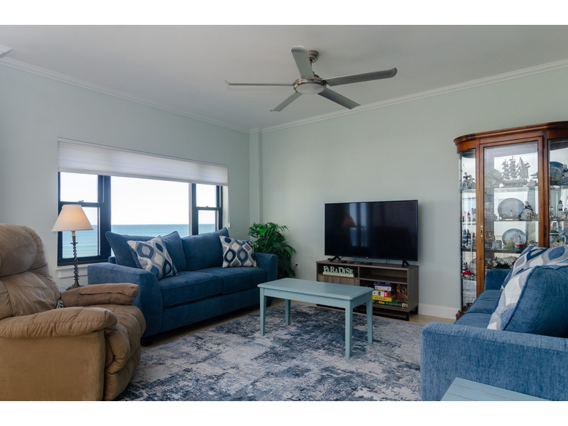 The main living area offers a comfortable living space and a beautifully renovated kitchen that opens to a spacious horseshoe balcony to maximize the ocean views. The deck is the perfect place to catch a spectacular sunrise or relax at the end of a long day. The spacious primary suite is complete with a king-sized bed, television, and updated bathroom that features a walk-in shower and large closet. There are two additional guest bedrooms at the front of the condo that overlook the marsh. A king guest room makes a wonderful accommodation for guests of any age and a nearby hall bathroom services this guest room. Across the hall is a bunk bedroom that has a pyramid bunk bed (full over full) and a private bathroom.