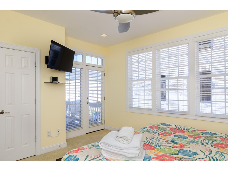 As you enter the home, you are welcomed into the ground floor foyer. The first floor of the home offers a full bathroom and a guest bedroom with a queen-sized bed. Upstairs you are welcomed by the stunning hardwood floors that guide you to the sleeping quarters. The first bedroom offers a pyramid bunk bed with a twin over a full bed, as well as a twin trundle. There is a television and attached jack and jill bathroom for added convenience. A second guest bedroom shares access to the jack and jill bathroom and is furnished with a queen-sized bed. The queen guest room also has a private deck. Across the hallway you will find the primary bedroom complete with a en-suite bathroom that features dual sinks and a walk-in shower stall.