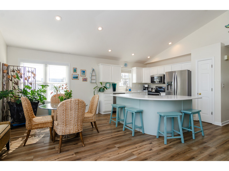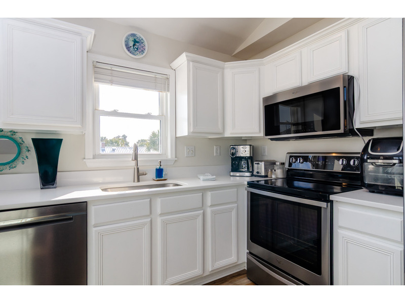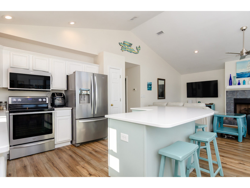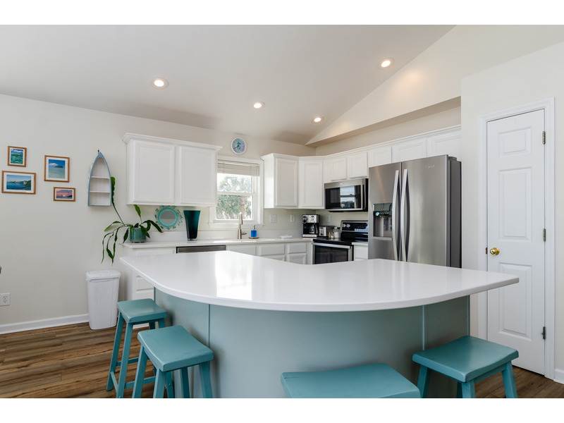 -Fully Equipped Kitchen: The kitchen is complete with stainless steel appliances including a refrigerator, oven, stove, microwave, and dual pod/drip coffee maker. Whether you're whipping up breakfast before a beach day or hosting a family dinner, this kitchen has everything you need.
