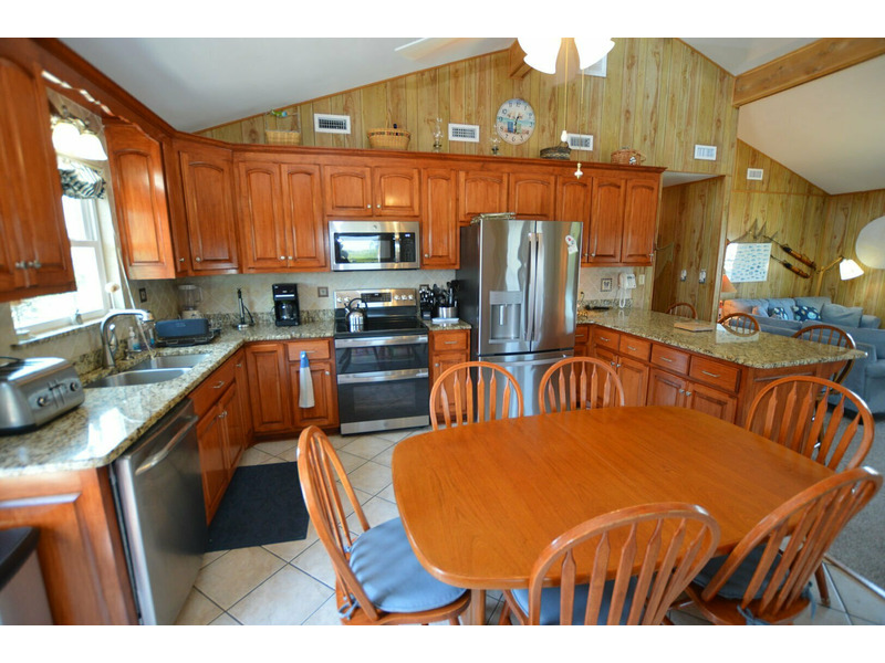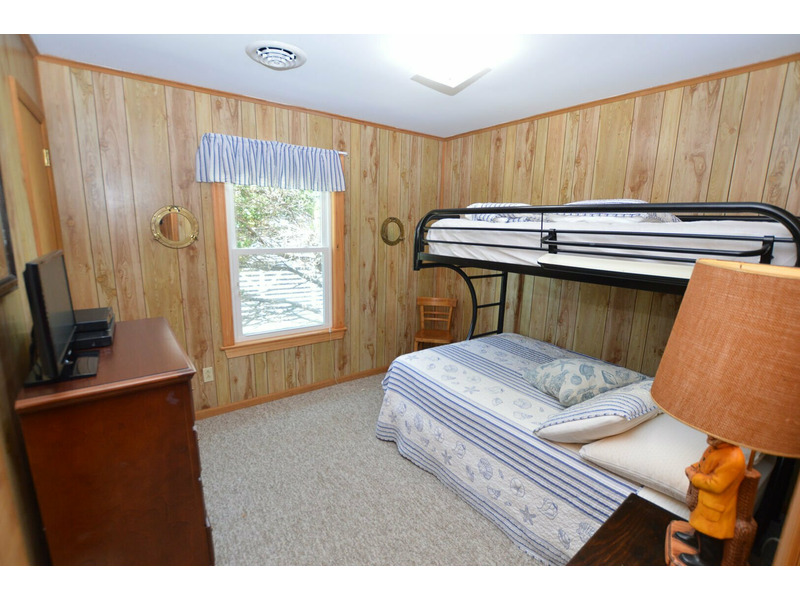 LEVEL 1: Living Room, Dining Area with Seating for 8, Kitchen with Breakfast Bar with Seating for 3, Master Bedroom with Queen and TV, Bedroom with Queen and TV, Bedroom with Twins, Bedroom with Pyramid Bunk and TV, Full Bath, Screened Porch with Hammock, Picnic Table and Rocking Chairs.
