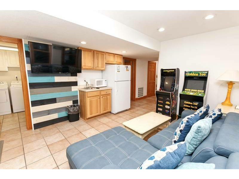 Ground Level: Queen Bedroom with TV/VCR and a semi-private bathroom (second door from bathroom to hallway), Bedroom with 2 Bunk Sets, Trundle and TV/VCR and a Recroom with TV/VCR/DVD, arcade style game, stereo, movie library, Queen Sleep Sofa and a wet bar including microwave, sink and a full refrigerator. Laundry area with washer and dryer.