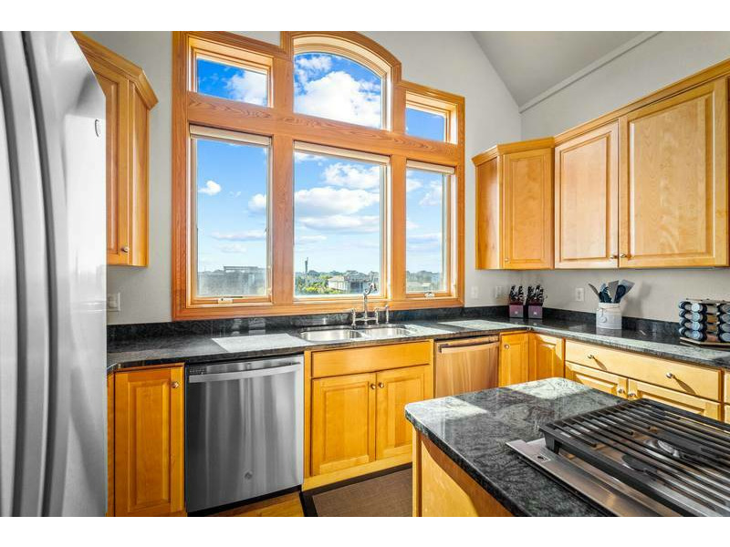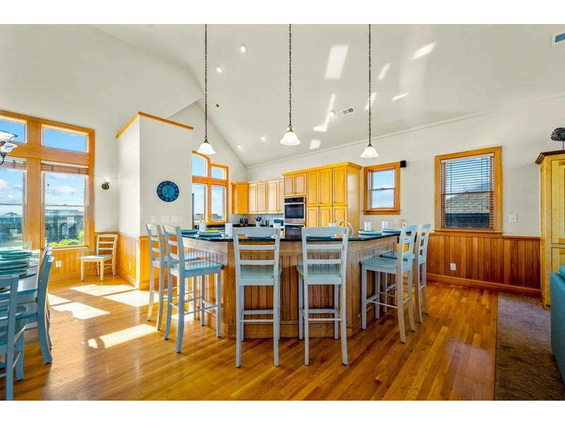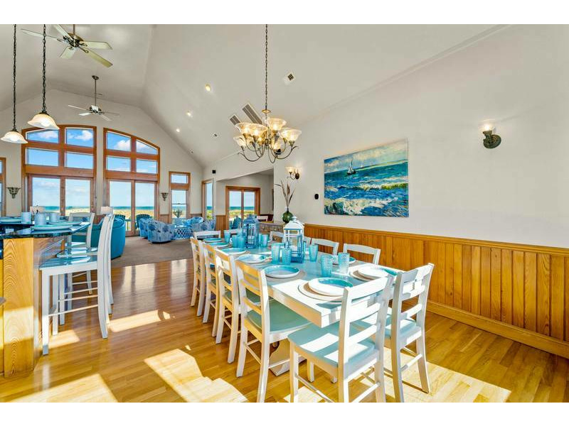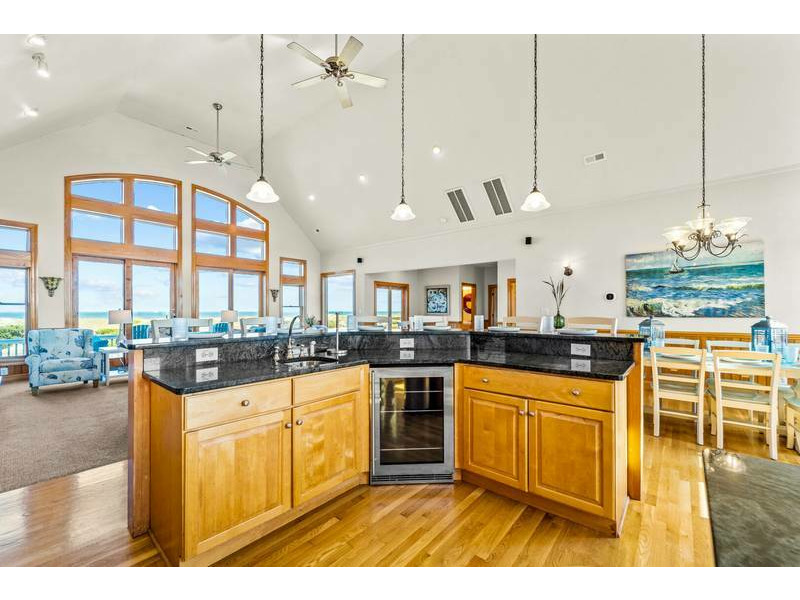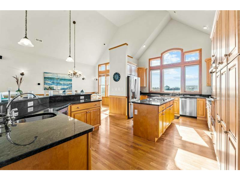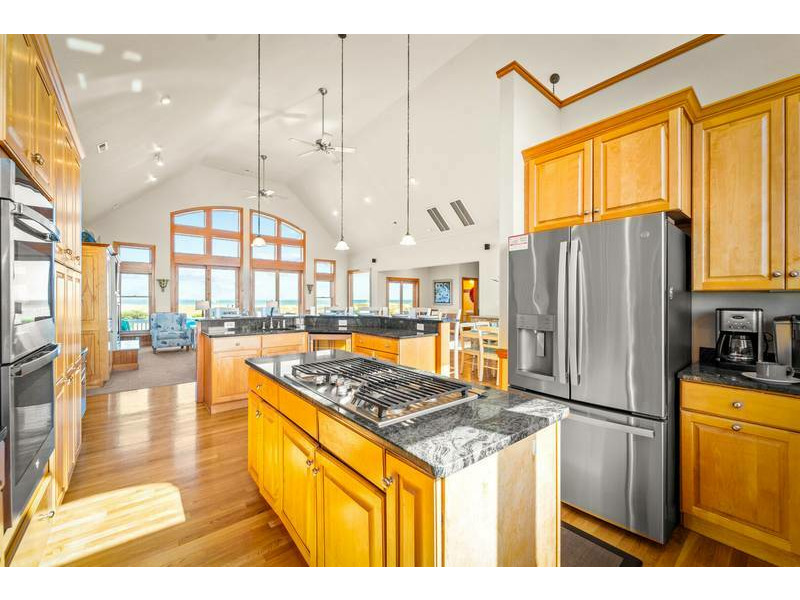 Third Level: Accessible with the convenience of an elevator, the open-concept great room boasts 20' cathedral ceilings, hardwood floors, chic coastal furnishings, and floor-to-ceiling windows that infuse this space with warm casual elegance and natural light. Plentiful and comfortable seating provides an inviting retreat to entertain, play games, or simply enjoy a movie on the Smart TV with surround sound. For all you culinary enthusiasts, the spacious and well-appointed kitchen features granite countertops, and stainless steel appliances including a French door refrigerator, under-counter wine/beverage cooler, two dishwashers, microwave, 5-burner gas cooktop, and a double wall oven which make meal preparation an enjoyable affair. Along with the generous dining table, raised bar tools surround the breakfast bar adding extra seating for the whole family at mealtime. Along with a half-bath just off the great room, there is an oceanfront King master suite with double vanity, jacuzzi tub, large tiled shower (dual heads), walk-in closet, private balcony, and 55-inch Smart TV that complete this level.