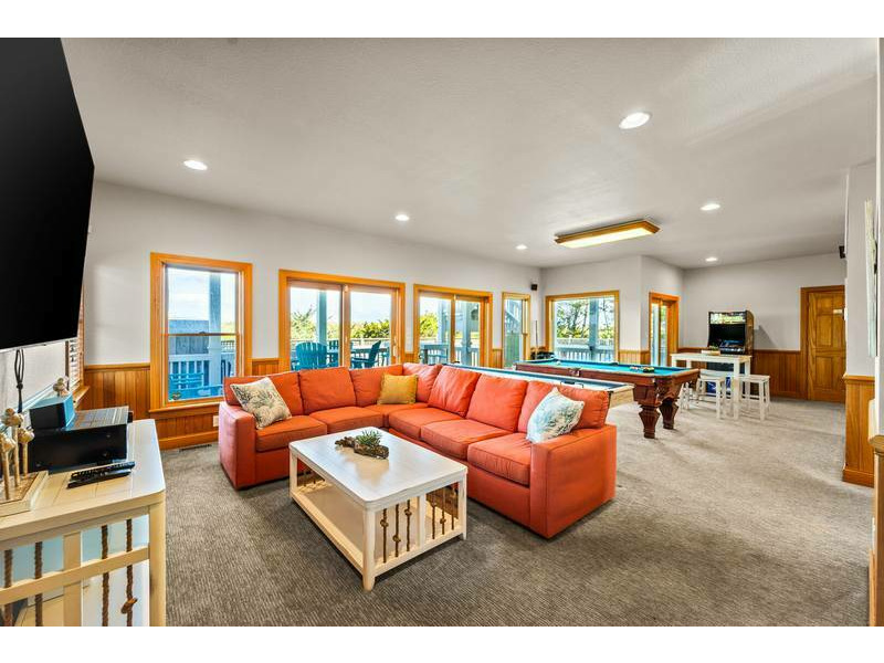 First Level: Just inside, there is a wet bar/kitchenette with a full-size refrigerator in the recreation area that will delight all ages. There's a billiards table, a shuffleboard table, and an arcade-style game console featuring 60 games for those competitors in the group. Additionally, there is a media area with a large sectional and 85-inch Smart TV with surround sound which is perfect for movie nights and entertaining the kids. There's also a laundry area and half-bath on this level. Completing this level are two master bedrooms with ensuite baths and smart TVs: there is one King suite and one Double bunk suite that sleeps 6 (2 single over double bunk sets).