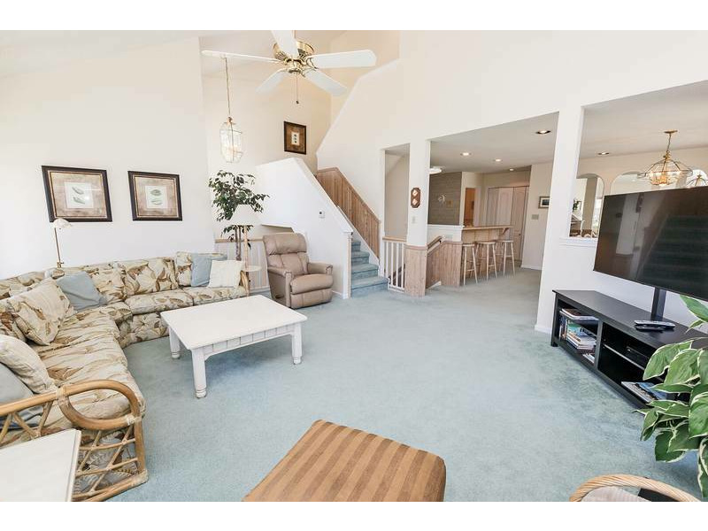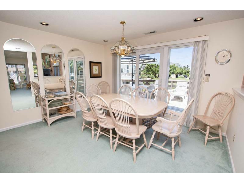 Ground Level: Entry level.  Bedroom with a Queen, Single,  flat-screen TV, desk and chair, full hall bathroom and a Bedroom with 2 Bunk Sets,  flat-screen TV and patio access with loveseats, chairs and tables seating 9. Garage with extra refrigerator, beach cart, corn hole boards, children's sand toys  and beach chairs. Along with a bookcase of books, puzzles and games. (additional games are located in a bin in the first floor bedroom closet).