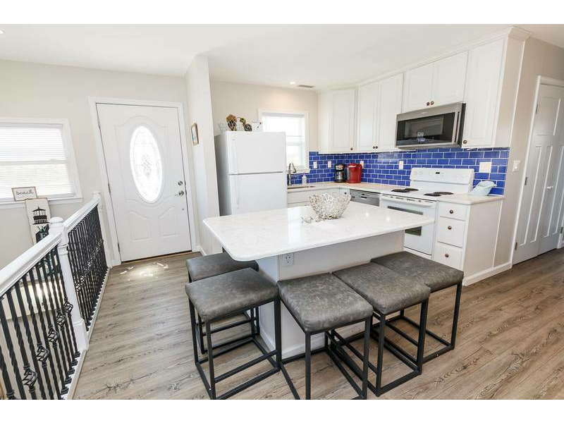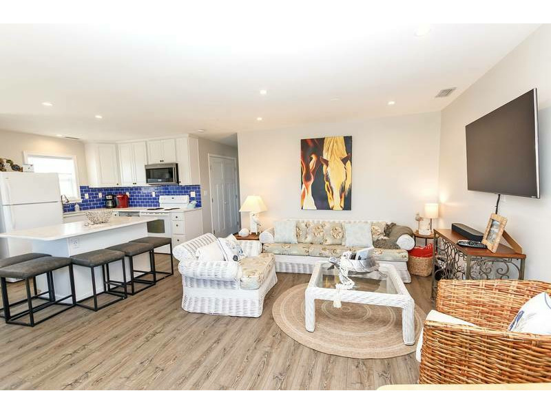 Top Level: Great room with flat-screen TV and sound bar. Kitchen with counter seating for 5 and the dining area seating 4. King Master Bedroom with flat-screen TV and private bathroom, Queen Bedroom and a full hallway bathroom.