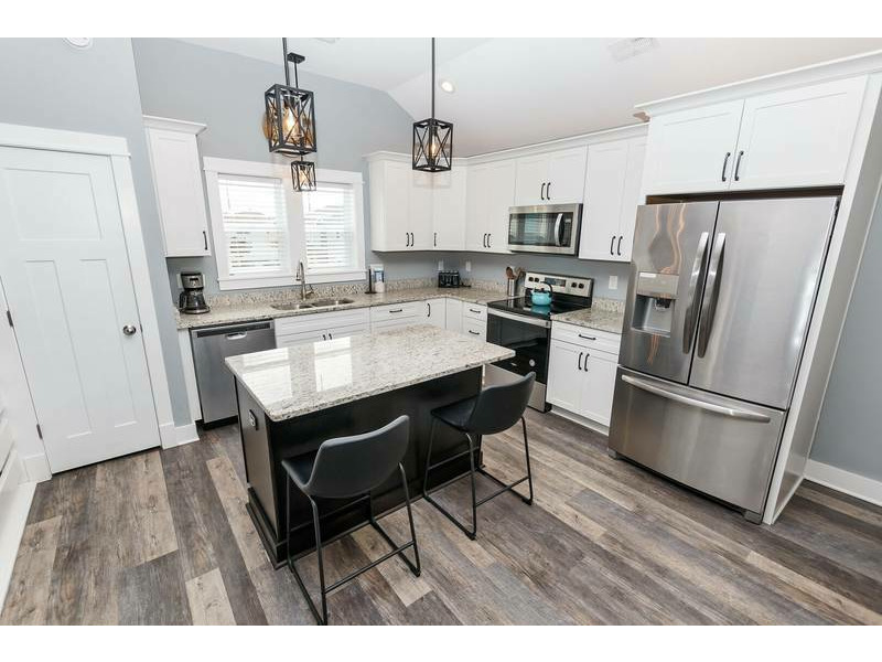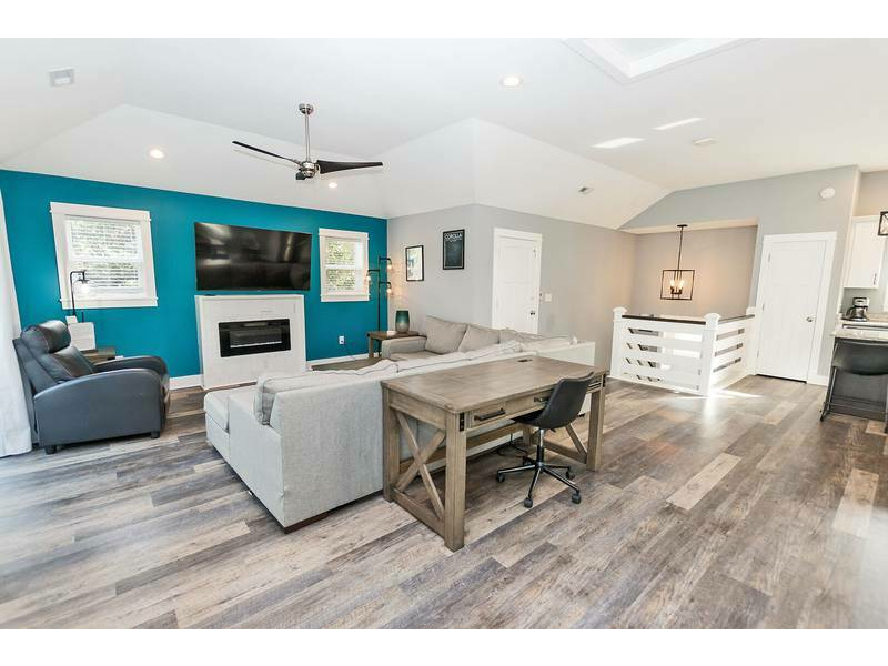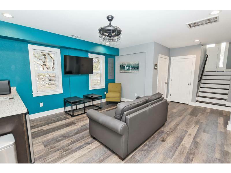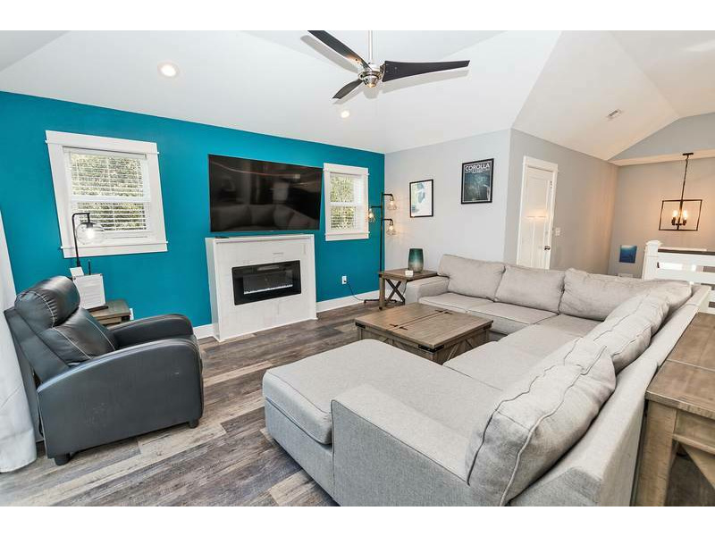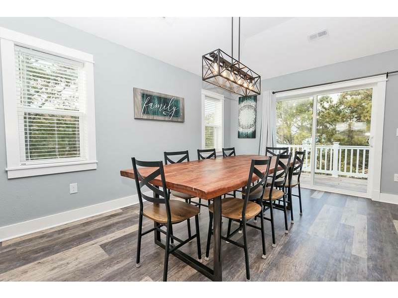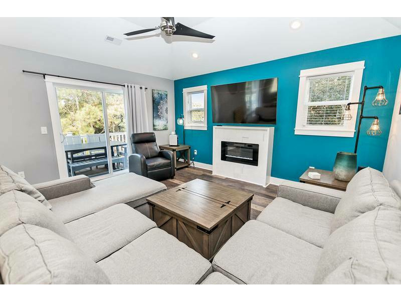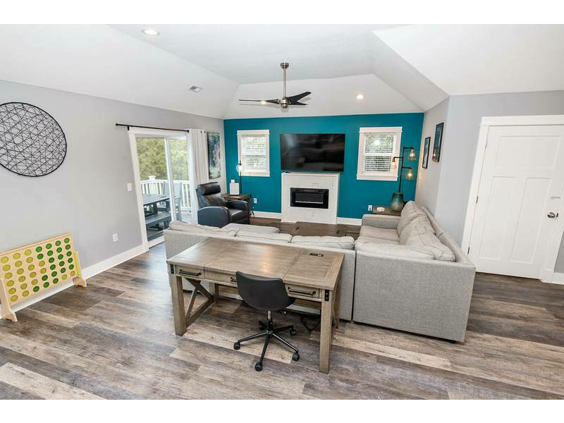 Top Level: Large open great room with large flat-screen TV, electric fireplace, desk and deck access. Kitchen with all stainless steel appliances and counter island seating for 2. Dining area seating 8 with an additional outdoor dining table seating 6 on the furnished sun deck.