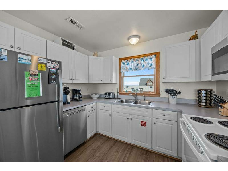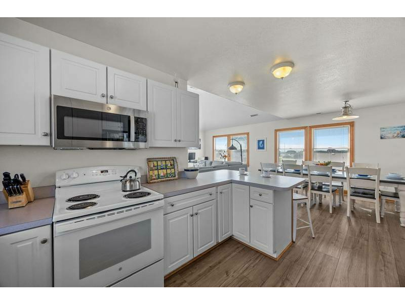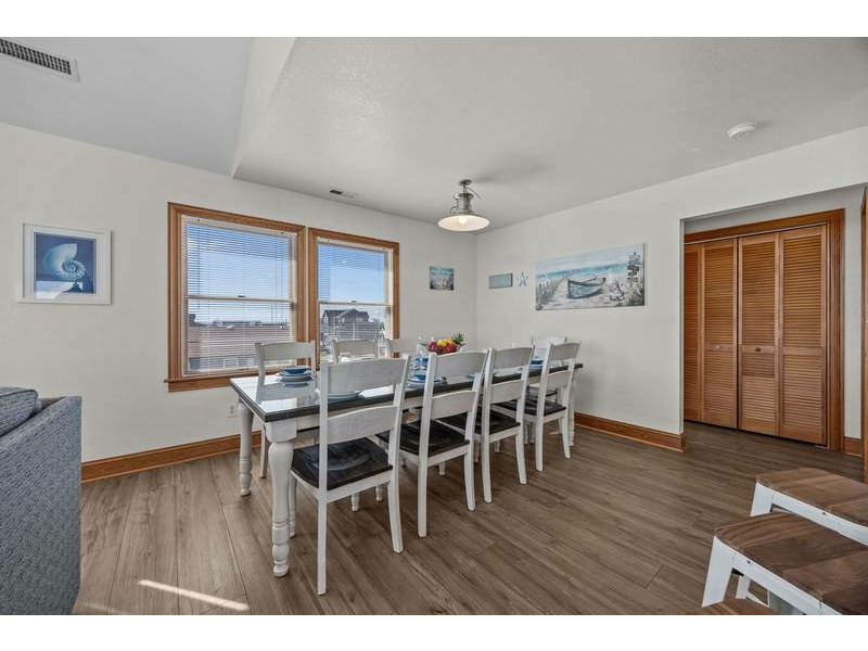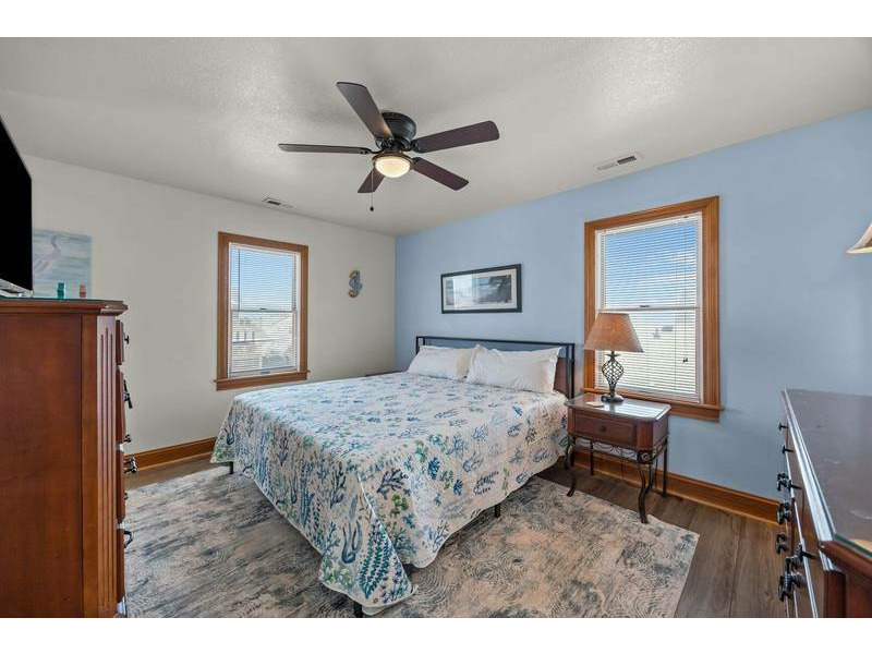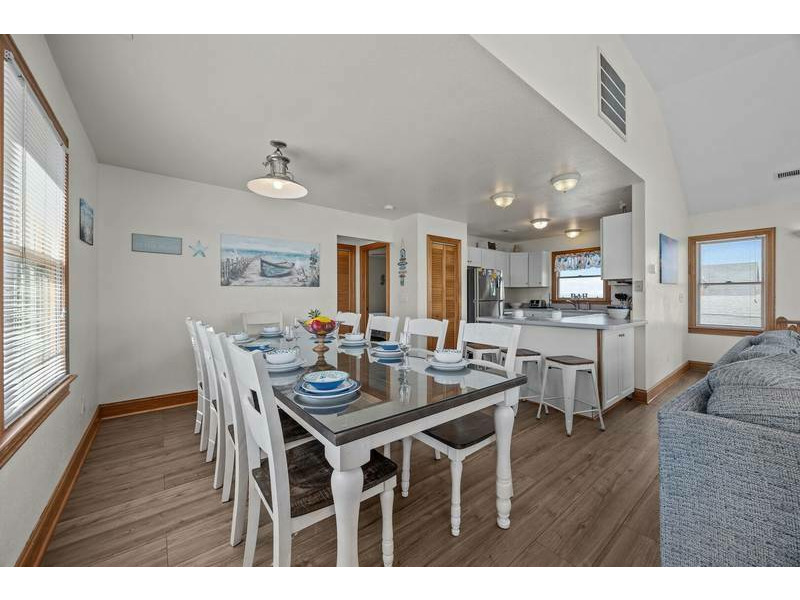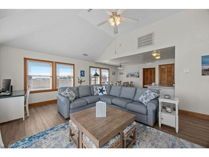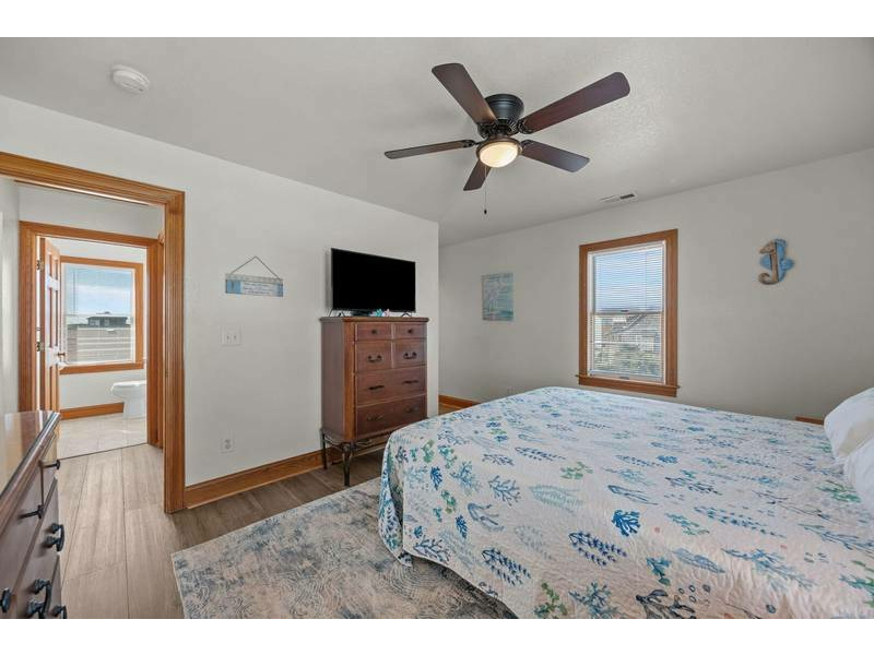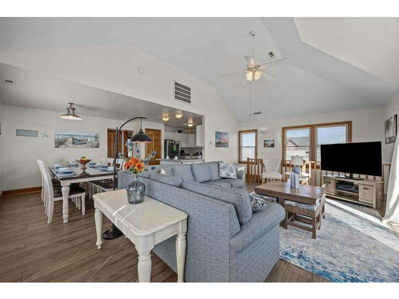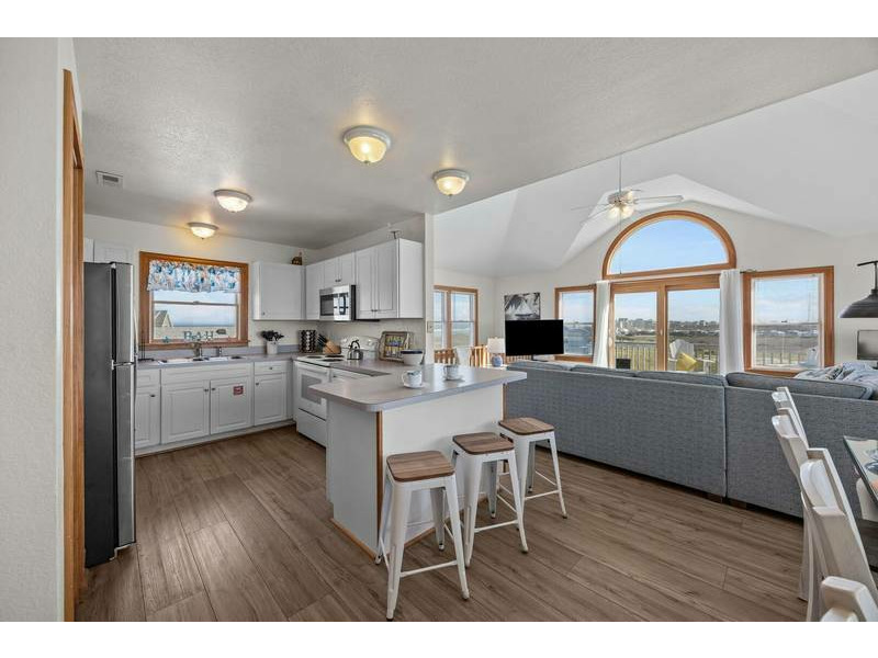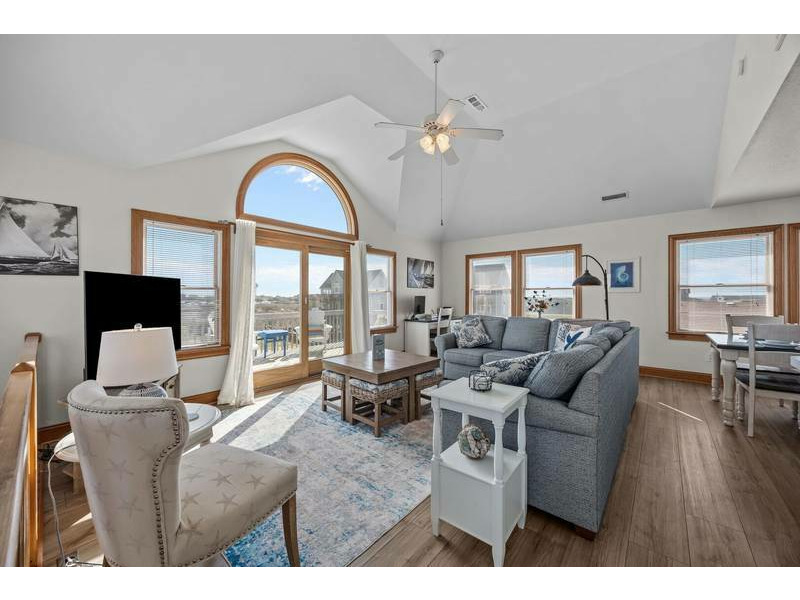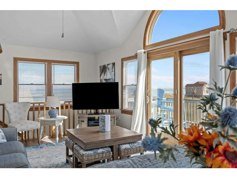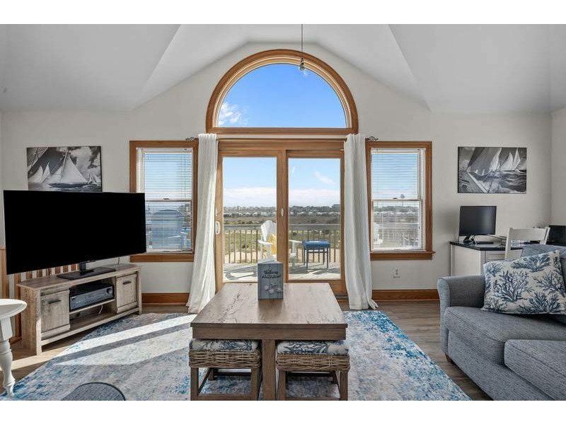 Top Level: At the top of the ship, you'll discover the true heart of the homeâ"a bright and airy open-concept space thoughtfully designed for making memories together. The inviting living room flows effortlessly into the dining area, which features seating for ten. The fully equipped kitchen has everything you need for whipping up a seafood boil or enjoying laid-back beach snacks. The top-level king en suite bedroom, complete with its own TV, is a peaceful retreat after a day of sun and sand. Just beyond the living space, the sun deck offers front-row views of breathtaking ocean sunrises, star-filled skies, and even a glimpse of local history, with the Chicamacomico Lifesaving Station's Breeches Buoy Rescue Drill reenactments visible from your private perch.