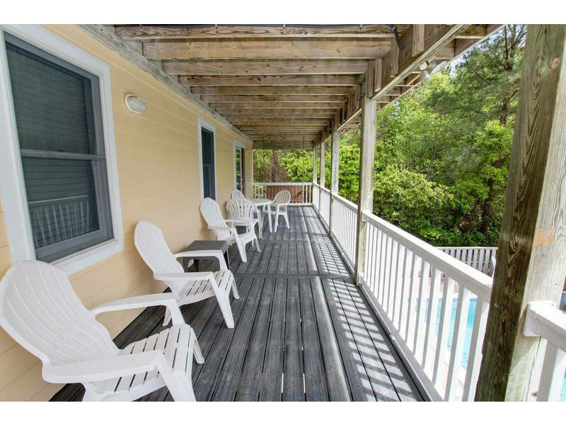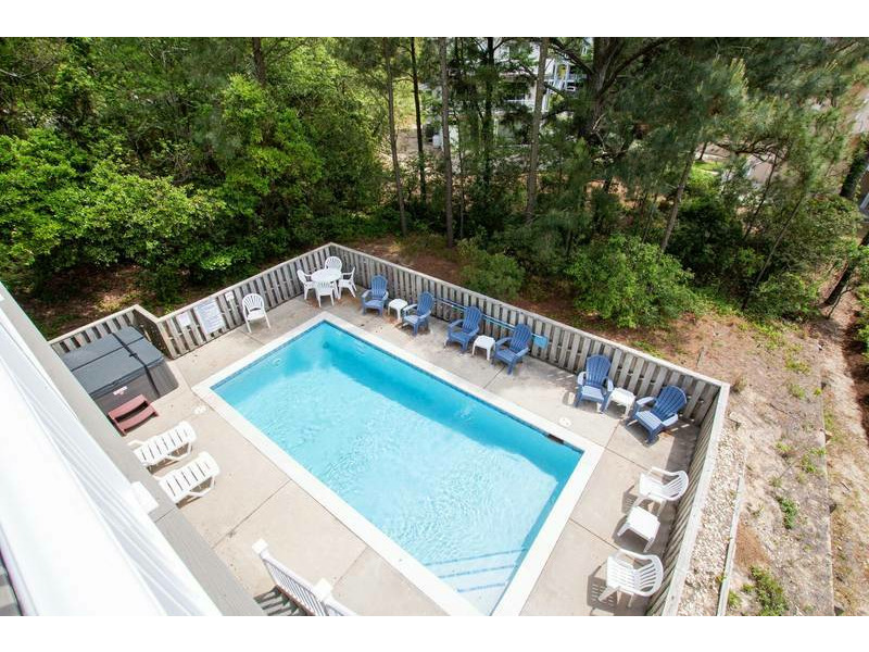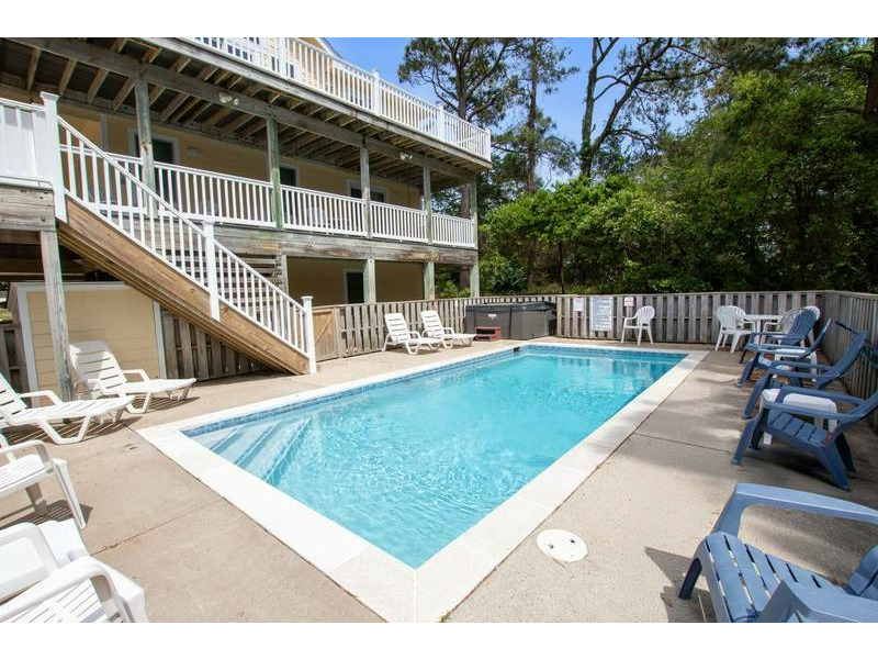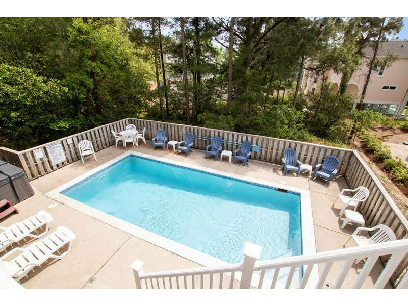 Extras: Private Pool (14 x 28), Hot Tub (6), 6 TVs, 4 DVD players, video/DVD/book libraries, wireless high-speed internet access, high chair, corn hole, basketball hoop, outside shower, 2 picnic tables, charcoal grill, parking for 5 vehicles, community water, linens and towels provided and Monteray Shores community amenities. Fully stocked renters closet with beach chairs and beach / pool toys. No Smoking. Dogs Welcome. Full week rentals only. House Address: 848 Oak Ridge Court. Beds: 3 Kings, Queen, 2 DuoBunks. Key Type: Keyless Entry. CHECK IN LOCATION: 1023 Ocean Trail, Corolla Office.