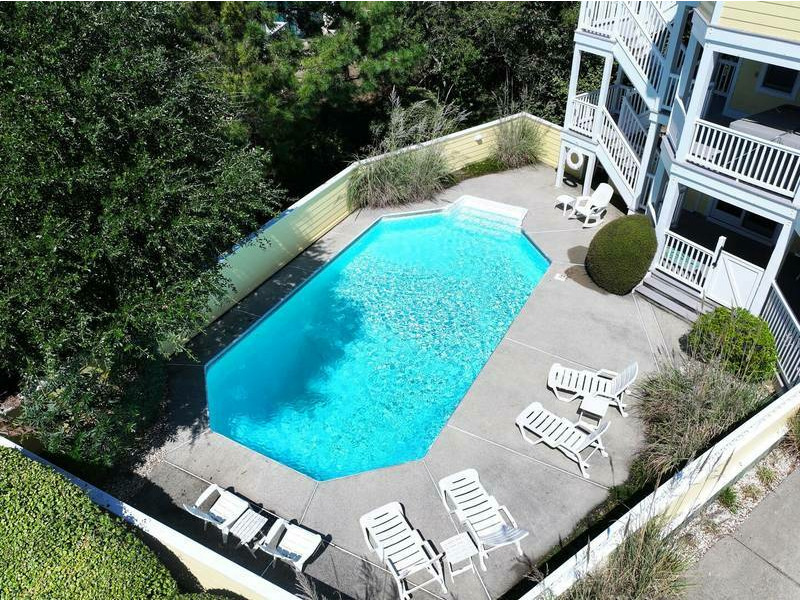 Extras: Private Pool (14 x 28), Hot Tub (4-6), 5 TVs, high-speed wireless internet access, 2 full-sized refrigerators, high chair, pack-n-play, foosball table, books, games, puzzles, screened porch, outside shower, picnic tables, gas grill, kitchenette, community water, swing, plenty of beach chairs, beach and pool toys, linens and towels provided and Buck Island community amenities. Parking for 5 vehicles.  No Smoking. No Pets. Full week rentals only.  Distance to beach access: 1305'. House Address: 798 Apollo Road. Beds: 2 Kings, 2 Queens, 2 Singles, Queen Sleep Sofa. Key Type: Keyless Entry. CHECK IN LOCATION: 1023 Ocean Trail, Corolla Office.