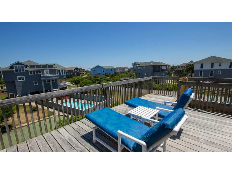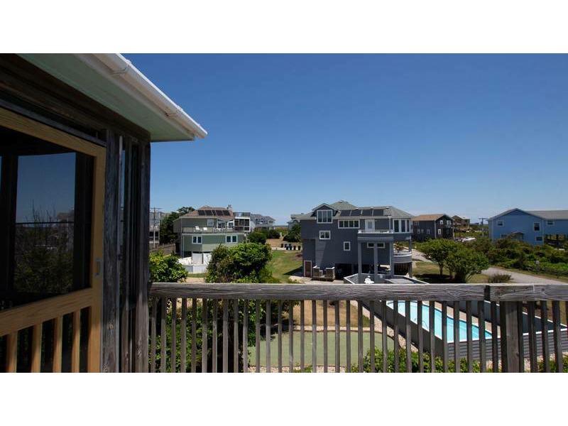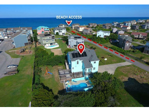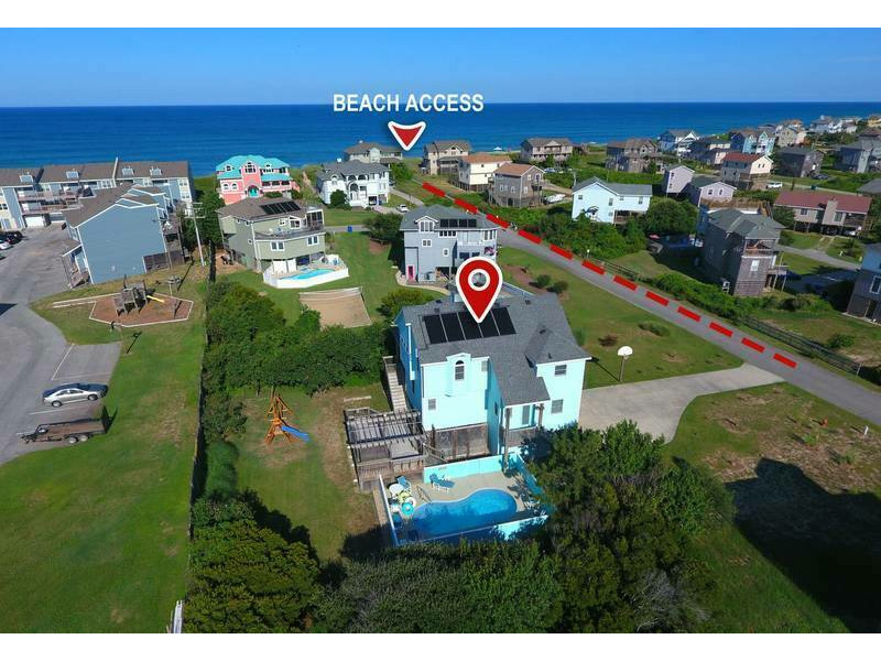 Extras: Private Solar Heated Pool, (12 x 24), Hot Tub (6), 5 TVs, 1 DVD player, stereo/CD, high-speed wireless internet access, DVD/book libraries, card/game table, basketball hoop, swing set, porch swing, screened porch, outside shower, wood-burning fireplace, community water, charcoal grill and parking for 5 vehicles and linens and towels provided. No Smoking. Dogs Welcome. Full week rentals only. Distance to beach access: 240'. House Address: 122 Flight Drive. Beds: 3 Queens, DuoBunk, Trundle, Queen Sleep Sofa. Key Type: Keyless entry. CHECK IN LOCATION: 1213-C Duck Road, Duck Office.