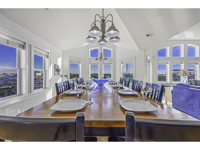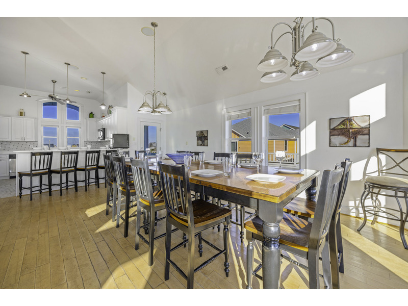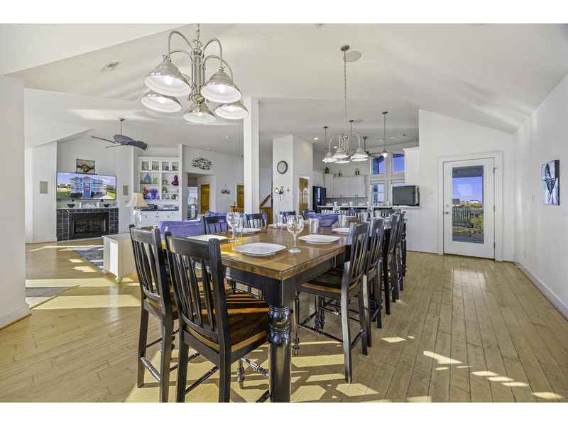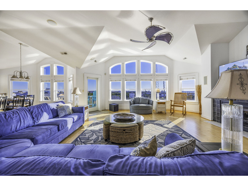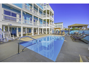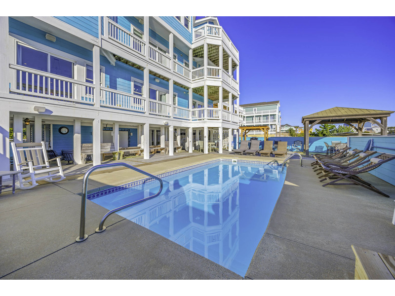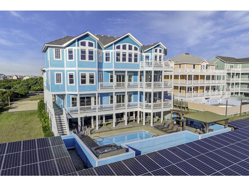 OCEANVIEW Rodanthe - Hatteras Island Estates - From its prime location near the beach, all 5,900 sq. ft. , to the many amenities of the home, you're sure to appreciate this PEACEFUL RETREAT. Green features set this home apart with its large array of solar panels and electric car charging station. Generous parking area including some covered parking welcomes you with lockable underhouse storage for sporting gear and ground level access to the all-level elevator (with 4" entry lip) to make unloading luggage and groceries a breeze. The pool area extends to include a sizable entertaining area under and adjacent to the home featuring the decadent hot tub, a cedar grill gazebo, convenient half bath, full size refrigerator, plenty of seating for the group, and outdoor theater with a 1080p high def projector, 10 ft. screen, and Roku streaming to enjoy your vacation in style. Inside the home, indoor recreation begins with the expansive game room with pool table, foosball table, poker table, home theater system with flat screen TV and surround sound, and kitchenette with wet bar, full size refrigerator, microwave, ice machine and wine cooler. Also on the first level are two bedrooms, one king master bedroom with private bath and one bedroom with two pyramid bunks (one with a trundle) and a semi-private bathroom shared with the game room. The mid- level of the home will please the movie lovers in the group with a TV lounge/Den with home theater system with an 86" flat screen TV and surround sound. Also on this level are three more king master bedrooms and a second bedroom with two pyramid bunks (one with a trundle), and a semi-private bathroom. The top level great room offers vaulted ceilings, hardwood floors and water views through windows that bathe the room in light. Gather around the home theater system with large screen TV and surround sound while the chefs in the family prepare meals in the bright, open kitchen with breakfast bar and double dishwashers. The dining area features two large dining tables to seat the group. The final two king bedrooms are on this level, one of which is a king master suite with a separate tiled shower and decadent Jacuzzi tub. Escape just a few steps up from the great room to the loft area with breakfast table and slider to a veranda with ocean-to-sound views. A week or two in this PEACEFUL RETREAT is just a reservation away!