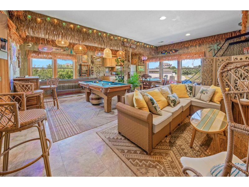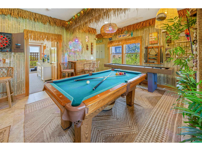 - Tiki lounge game room with pool table, poker table, shuffleboard, pop-a-shot basketball, Smart TV, Bluetooth speakers, bar with stools, electronic darts, and wet bar with sink, full-size refrigerator and microwave