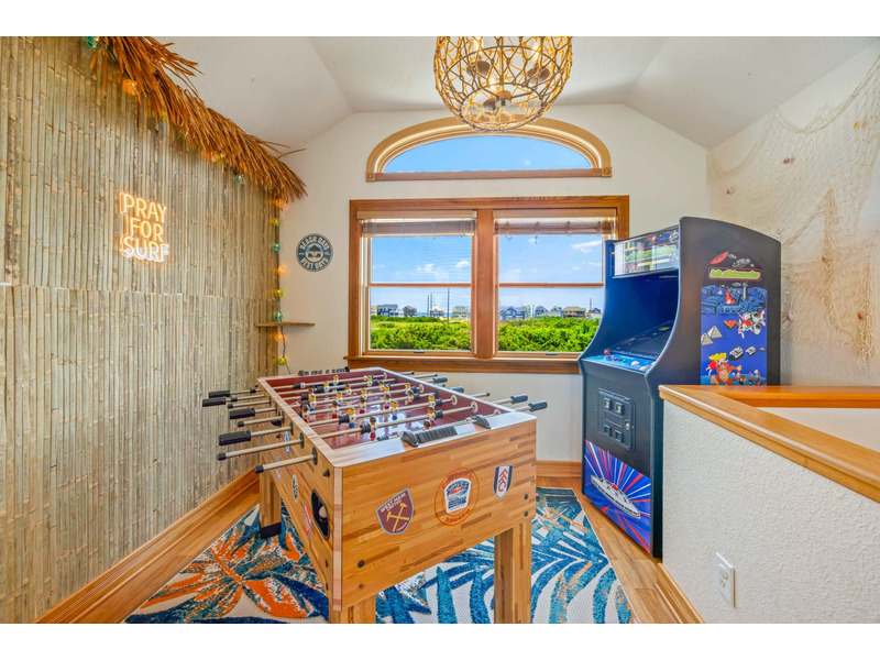 - Top floor game area with foosball table and arcade game