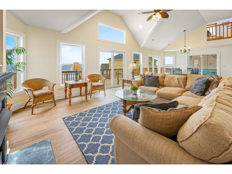 OCEANFRONT Rodanthe - South Shore Dr. - This spacious, tastefully appointed home on the Atlantic shore is the perfect place to relax and rejuvenate in uncompromising comfort. The paved carport at the entry level leads to a game room complete with air hockey and arcade games, TV, wet bar and half bath. Two master suites with full baths complete this level. The second floor has four bedrooms with ocean view, three of which have private access to a huge, shaded deck and 6-person hot tub. Two are king masters, one with Jacuzzi and separate shower, the other two bedrooms include one with two singles and one with two pyramid bunks. The third floor has an elegant master suite with tray ceilings and a Jacuzzi for two, surrounded by windows and separate glass enclosed shower. Soaring cathedral ceilings with custom windows, cypress trim, and custom molding truly make this one of a kind. The dining room leads to a large, screened porch with picnic table connected to a massive sundeck. The spiral stairway to the fourth level "ship's watch" tower room will lead you to tranquility, a memorable stay and PERFECT PEACE.