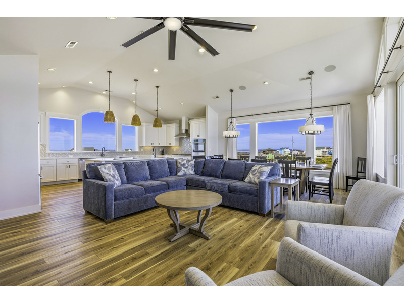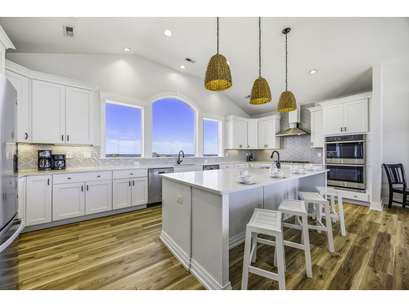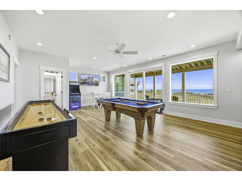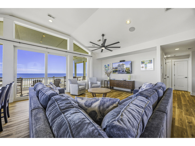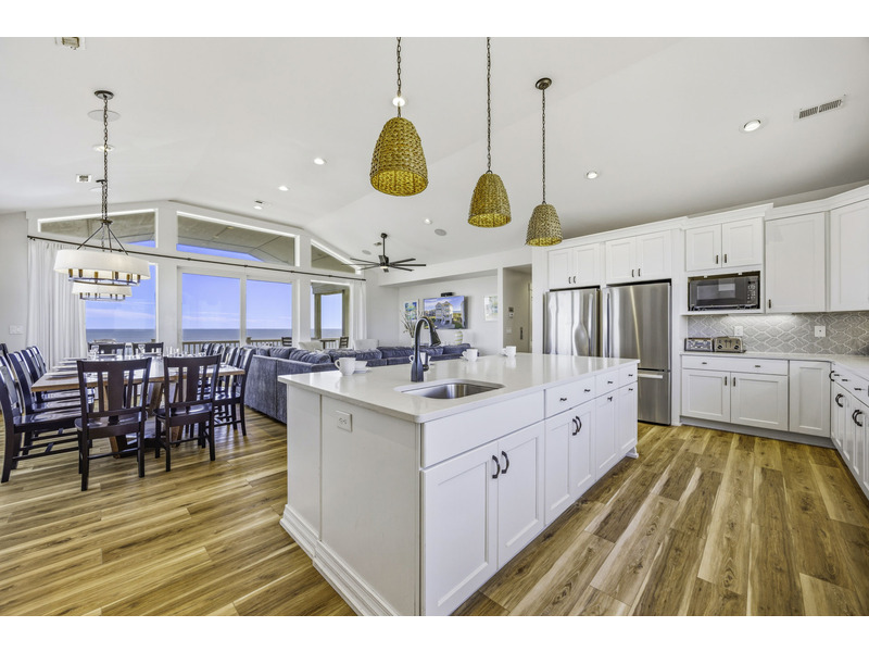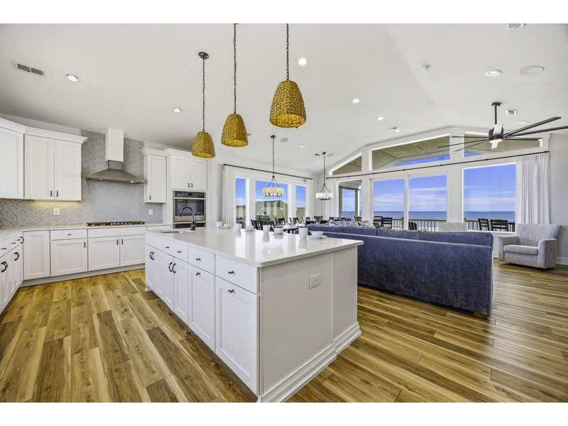 The top-level of this home offers breathtaking ocean views, plenty of seating, and a spacious gourmet kitchen with double wall ovens, two refrigerators, and two dishwashers to accommodate your group. Two king master bedrooms accompany this level, and both have direct access to the deck.