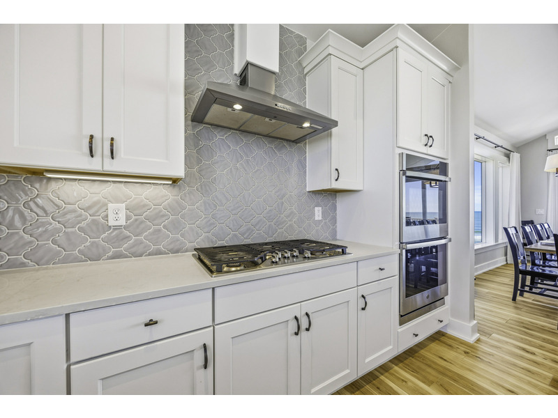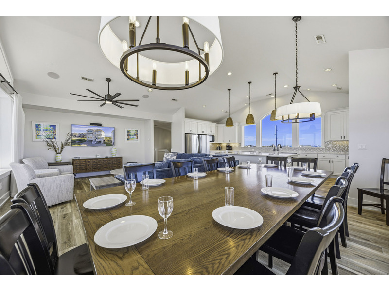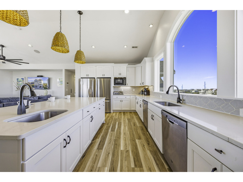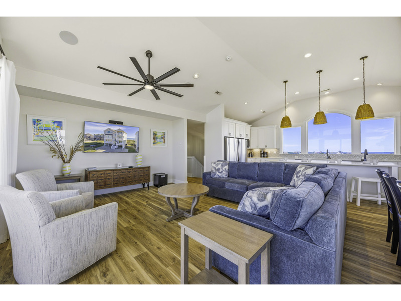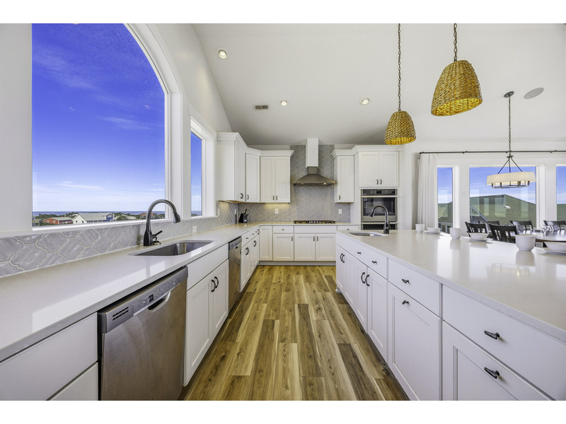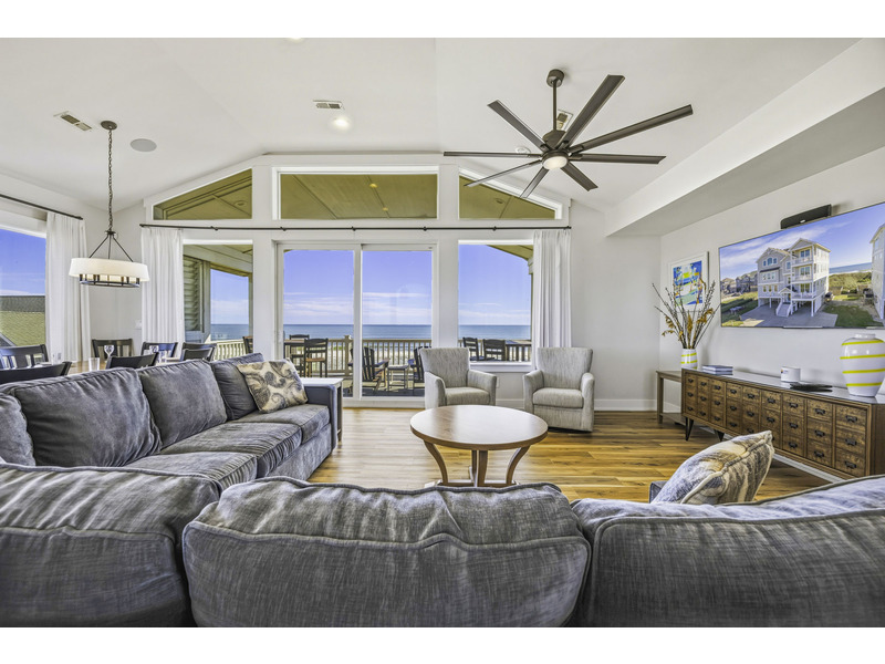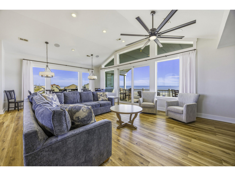 The top-level of this home offers breathtaking ocean views, plenty of seating, and a spacious gourmet kitchen with double wall ovens, two refrigerators, and two dishwashers to accommodate your group. Two king master bedrooms accompany this level, and both have direct access to the deck.