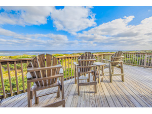 All the home's bedrooms offer Smart TVs. Four of them are located on the first level: two queen masters, both with deck access; a king master featuring a separate tub and shower and a dual vanity; and a room with two single beds. A washer/dryer is located on this level, as is a den -- a nice bonus space with a couch and Smart TV. The final bedroom, a king master featuring a zero-entry accessible shower, is located on the second level and opens onto the home's great room. Cathedral ceilings, lots of windows and an open floor plan enhance the space bringing everyone to together as you wind up for the day and wind down at night. Gather in front of the Smart TV from new furnishings, that is if the ocean view outside doesn't distract you. There's plenty of room for more than one cook in the spacious, fully equipped kitchen featuring all new appliances including two beverage refrigerators. Enjoy those meals together at a dining table seating up to 10, with a four-seat card table and a three-stool eat-at counter providing additional seating. Step outside to discover a furnished deck with rockers and Adirondack chairs to let the ocean breeze and starlit sky blissfully carry you away.
