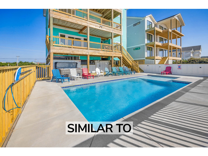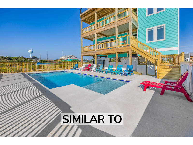 Ready for some action? Watersport lovers will love the Pamlico Sound's close proximity and easy access to the world-famous playground for avid kiteboarders and windsurfers, as well as convenient access in the backyard to the water via a bulkhead and dock. Guests also have access to Kinnakeet Shores community pool and tennis/pickleball facilities. Or settle into a state of serene relaxation beside your own saltwater pool. Let the bubbling warmth of an eight-person hot tub melt away any lingering tension, with thoughts of a cold beverage at the ready in the nearby tiki bar.