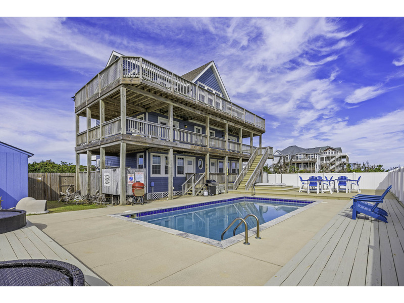 It's just a short stroll from the calm ocean waves and a large swimming pool, surrounded by inviting chaise lounges, a six-person hot tub, and two outdoor showers where you can take a refreshing rinse upon returning from the sandy beach. Two grills -- one charcoal and one gas -- give you options for afternoon cookouts. Need a break from the sun? Head into the game room on the first level. It's the perfect cool retreat, offering a Smart TV, pool table, arcade game console, and foosball table for endless entertainment. Plus, you'll find a full-size refrigerator, making it easy to grab a quick snack or a cold drink. With an ensuite bedroom outfitted with two pyramid bunks and another ensuite bedroom with two single beds -- both with Smart TVs -- this level is the perfect hang-out spot for the kids. A washer/dryer completes this level.