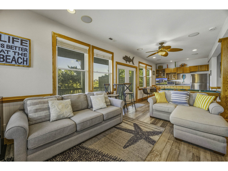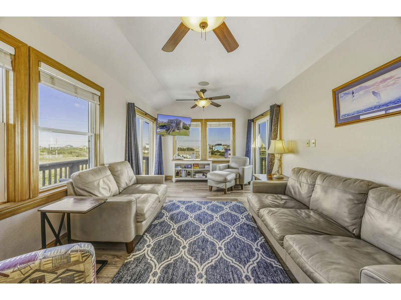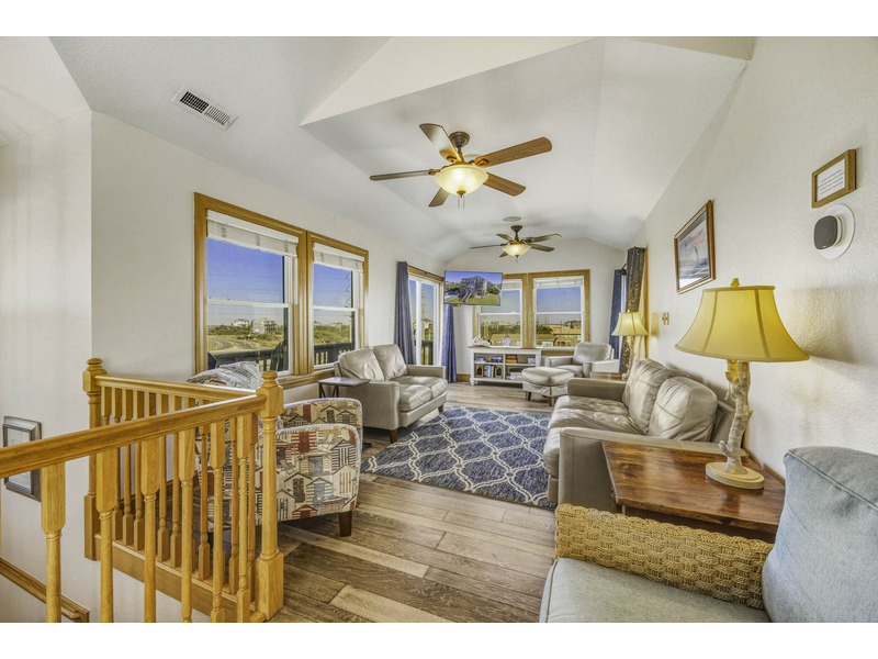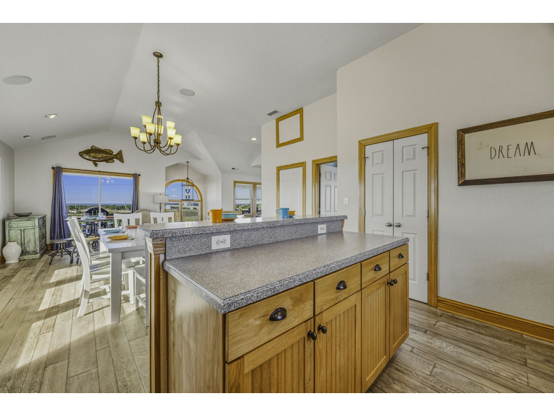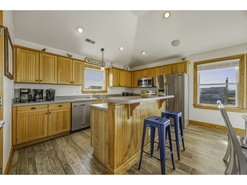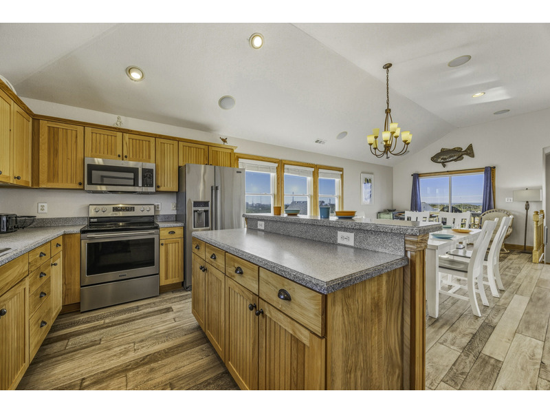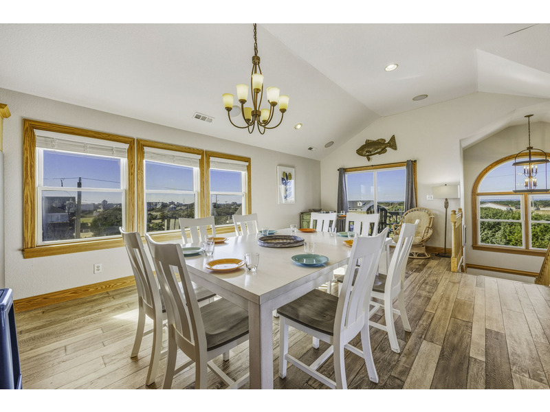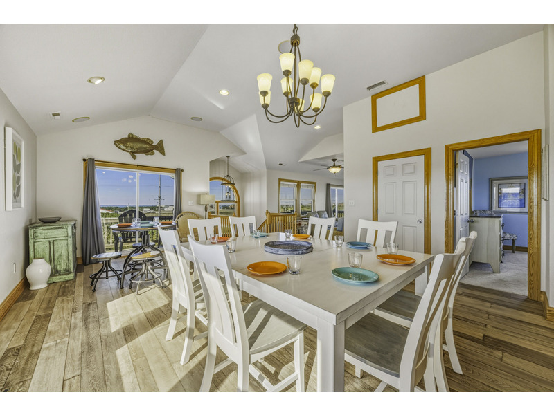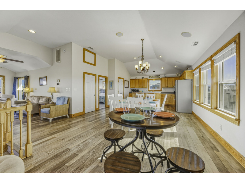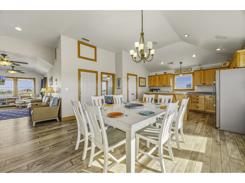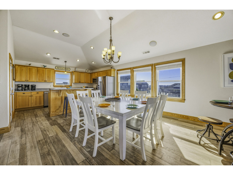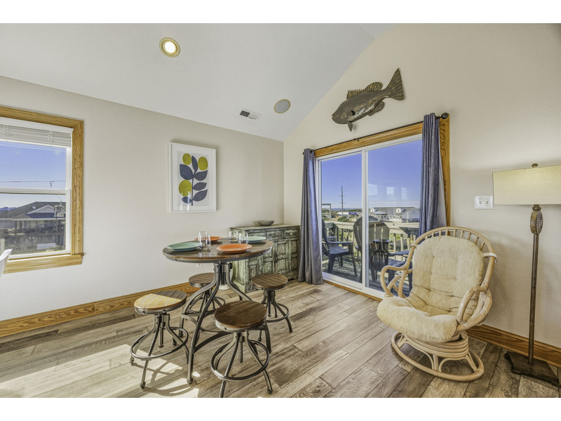 Also, on this level is the great room, designed to inspire your family's collective camaraderie. Two sets of doors open from this space onto lovely sun decks, perfect for enjoying the coastal breeze. For family meals, the spacious dining area offers abundant seating for everyone. A separate slider off this area leads to another sound-view deck, where you can catch the sun as it starts its colorful descent. The adjacent kitchen is ready for all your culinary needs, whether you're preparing a gourmet feast or enjoying takeout from one of the local Rodanthe restaurants. Finish the evening with a family game night or a movie on the Smart TV. Don't let the opportunity to book HIGH TIDE HAVEN drift away. Book it today!