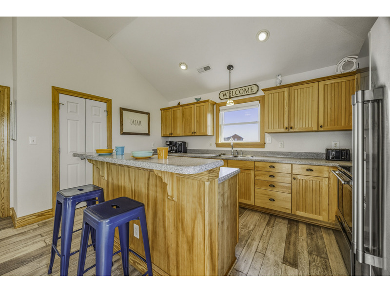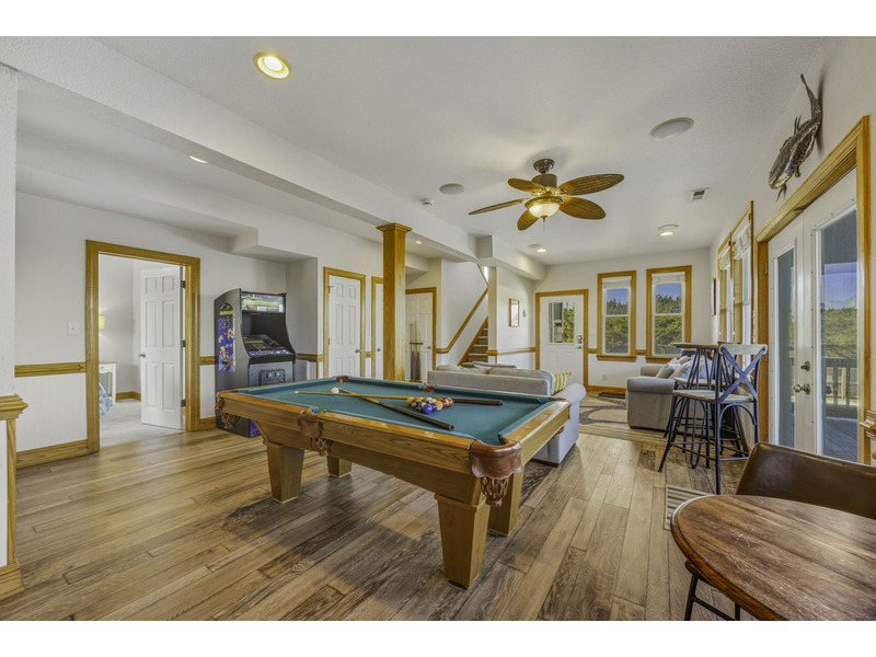Had enough sun? Head to the first floor and step into the game room, the perfect spot for friendly competition featuring a pool table, arcade game, and a Smart TV. The wet bar with a full-size fridge and microwave makes grabbing cold drinks and snacks easy, so you never have to leave the action. Just outside, an adjacent deck provides access to the 6-person hot tub where you can unwind after a day of adventure. For convenience, a handy half-bath is located nearby. This level also features the first of five spacious retreats: a king master bedroom with its own private ensuite full bath. Three more bedrooms -- a king master and a king and queen that share a Jack-and-Jill bath are located on the second level. All feature Smart TVs and have access to a furnished covered deck. The home's final bedroom, a king master with ensuite bath, Smart TV, and sun deck access is located on the third level.