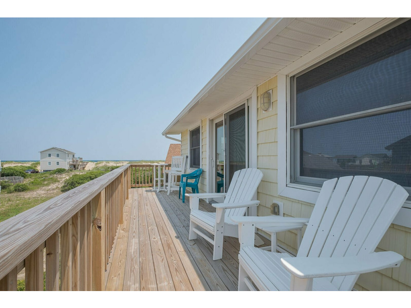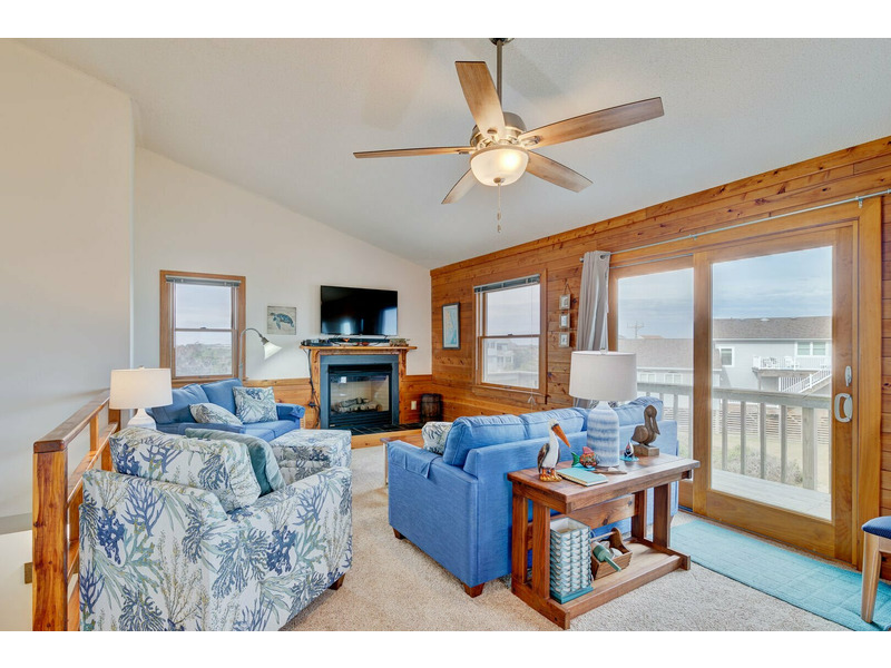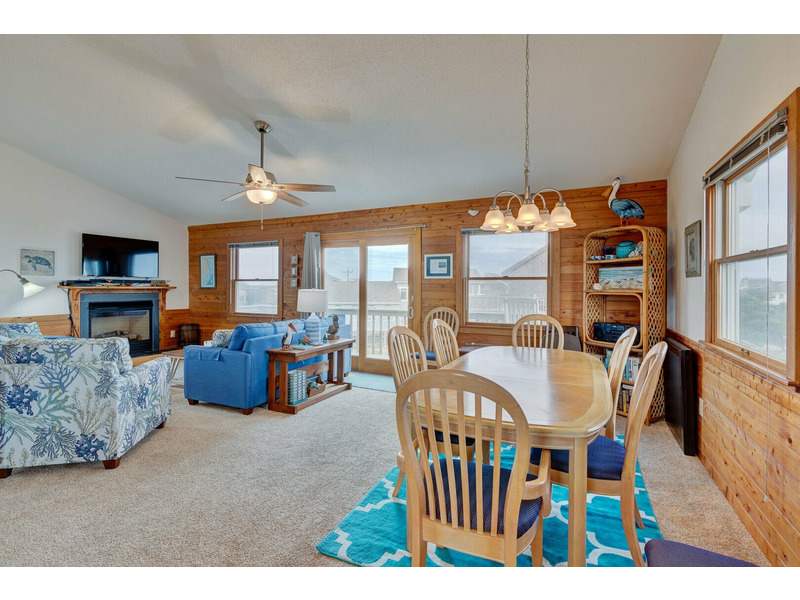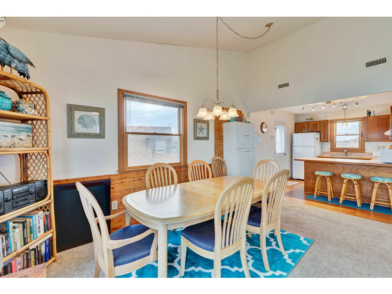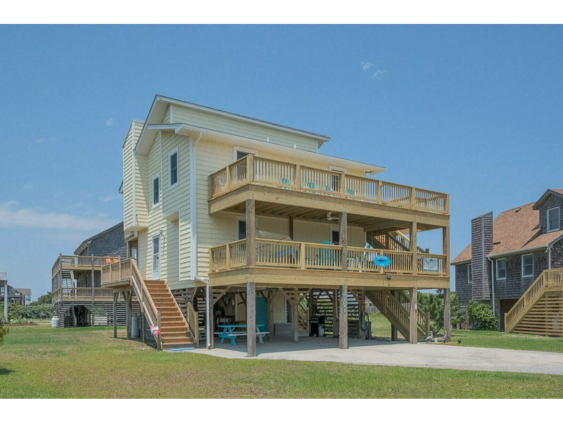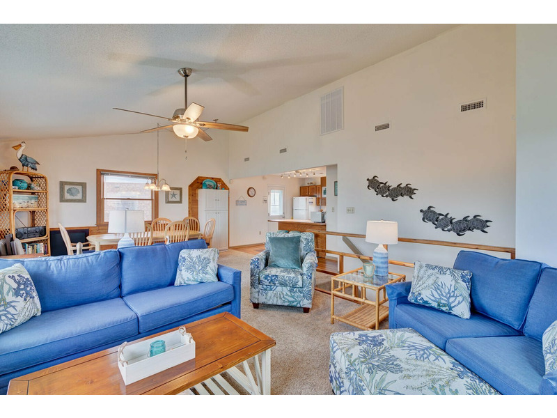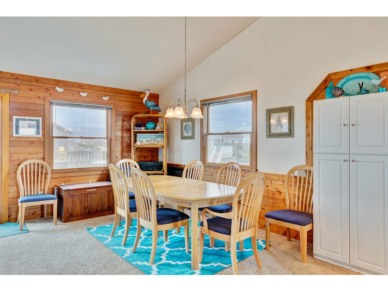 The fun doesn't end at the nearby amenities and easy beach access. Outside, kids in your group can play safely in the cul-de-sac while the adults take advantage of the corn hole set for some major fun. The under area of the home is not only for parking, but also doubles as a relaxing space in the shade; complete with a picnic table and bistro lights for nighttime entertaining. Inside Sea Quench, a chest full of games and puzzles awaits you to occupy time when you've had too much fun in the sun or when the occasional rainstorm passes by. The entry-level also offers a sitting area complete with couches and a flat-screen TV. Upstairs at Sea Quench, enjoy an open living area perfect for entertaining friends and family as well. When it's time to eat, the family chef can prepare dinner in the well-equipped kitchen or on the gas grill. There's dining space for everyone at the 8 person dining table and the breakfast bar with seating for 3. Plus, Sea Quench offers some seriously stunning views. At this Outer Banks rental, there are nearly 1,300 square feet of decking giving you wonderful ocean views! The furnished decks are bound to be your favorite place to enjoy your morning coffee with stunning sunrises as well as beautiful sunsets over the sound with an evening glass of wine. When it's time for bed, head to one of the 4 bedrooms for a restful night's sleep. Sea Quench truly has everything you're looking for and more for your next Nags Head vacation!