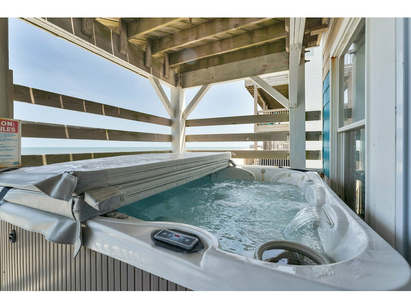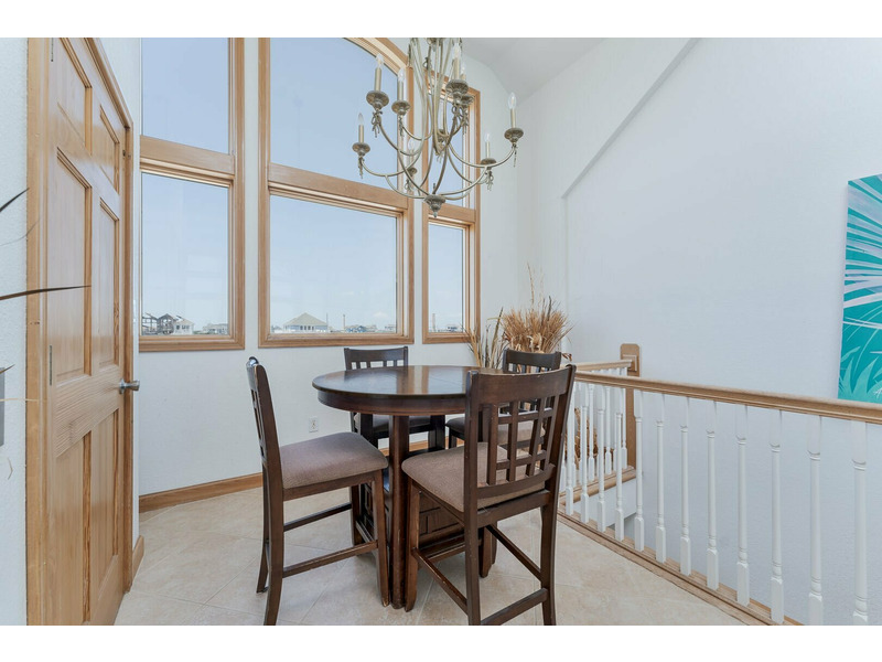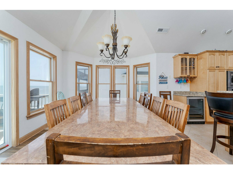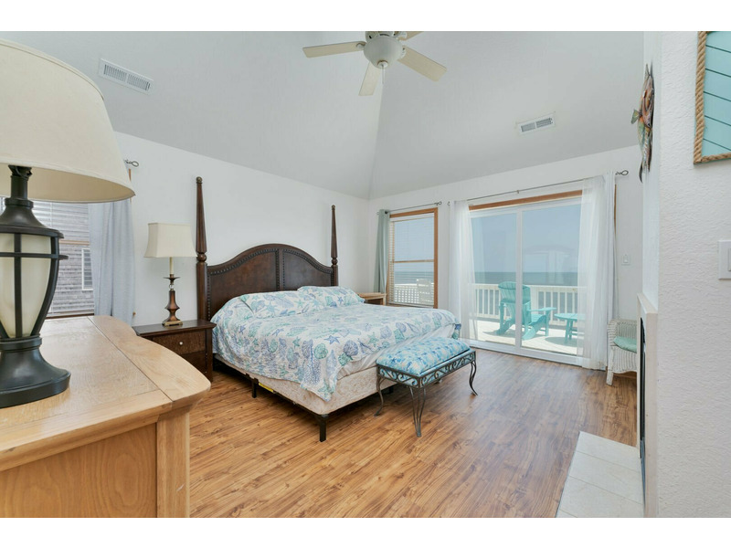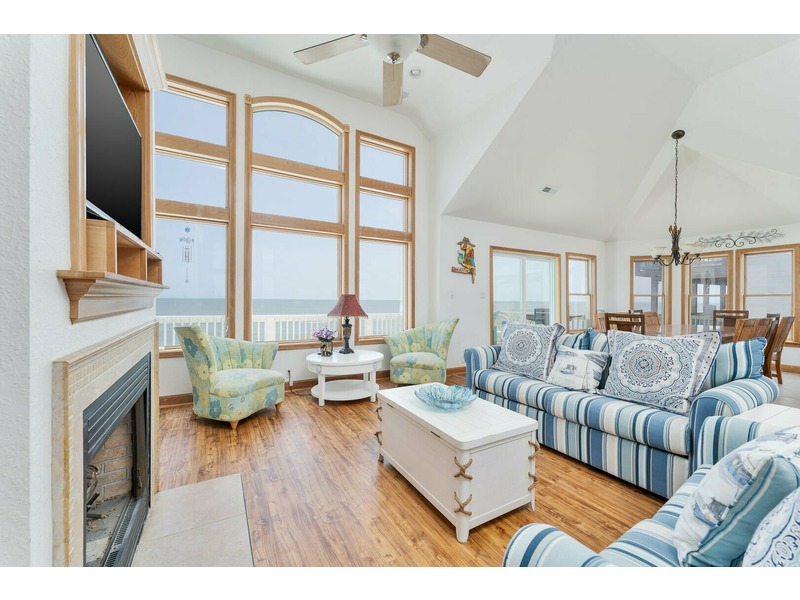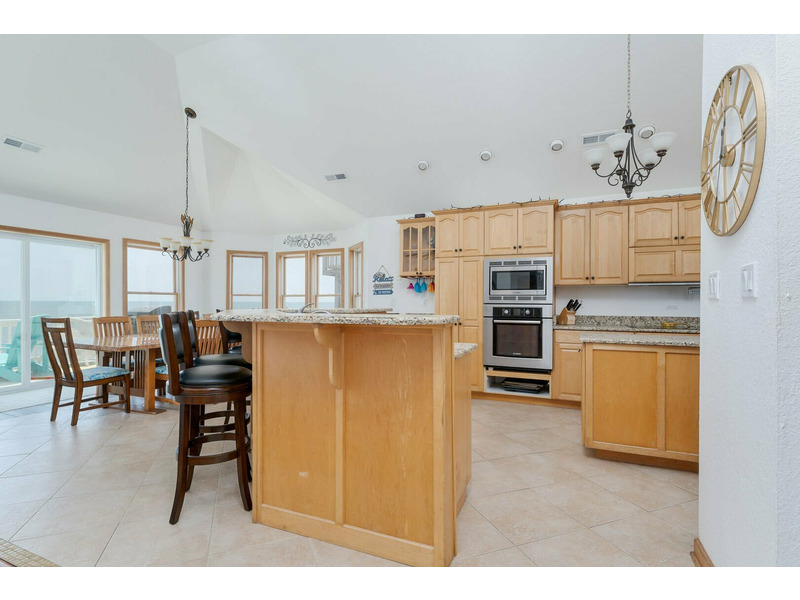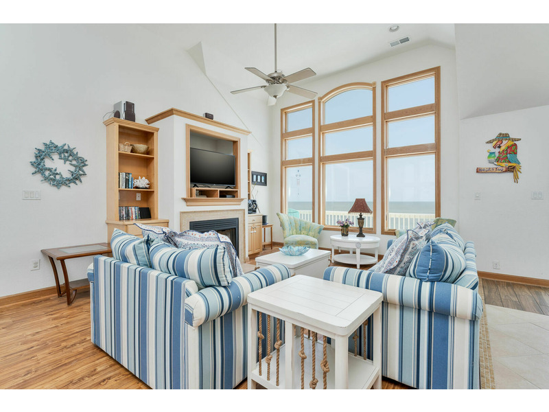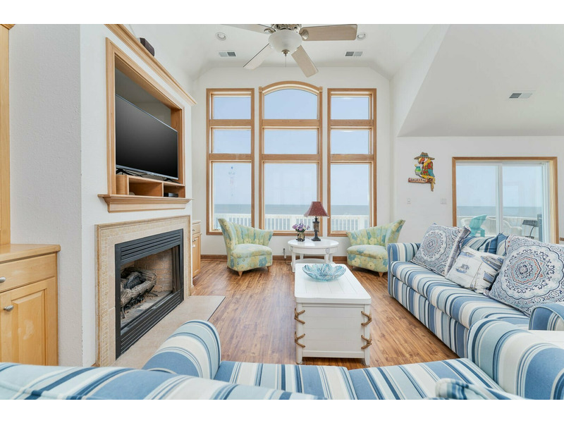 The interior highlights the ocean views with large open windows that perfectly frame the view. In the upper level great room you’ll find a large space to host all of your guests. The living area is lined in dark hardwood floors with comfy furniture and features a sitting area overlooking the ocean. The kitchen is spacious and functional with a center island and bar seating. Enjoy supper and a sunset as you feast at the dining room table. Relax and recharge in the private king master bedroom also on this level -- featuring cozy bedding, a large private bath with a soaking tub and tiled shower. Further sleeping accommodations are located on the mid-level where you’ll discover two master suites -- one featuring a queen sized bed and the other a double. Two King bedrooms with a shared bath and a room with 2 bunks also share this floor. (Bunk room does not have designated bath, will need to use one of the Masters on this level) Caribbean Queen has all the comforts and majestic views you’ve been craving. Book this exceptional home for your upcoming Hatteras Island getaway. All TVs are Roku and have streaming apps and live TV stations through Roku and through the internet provider.