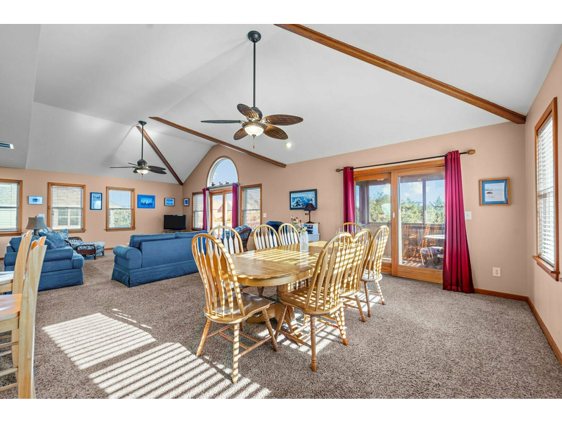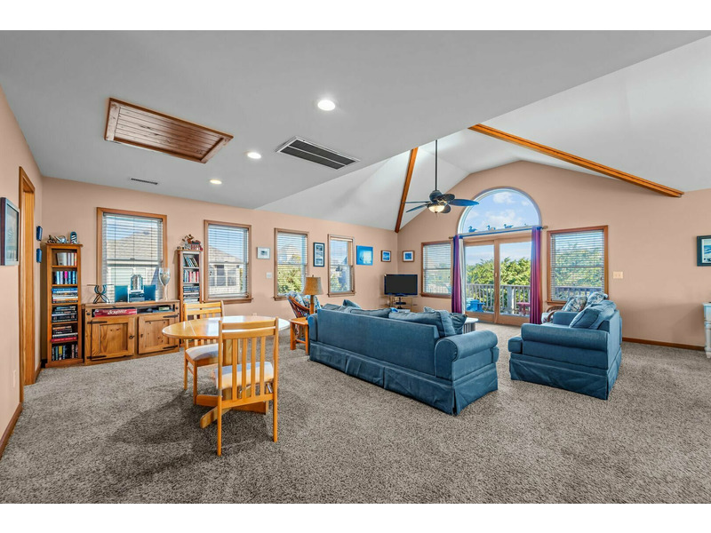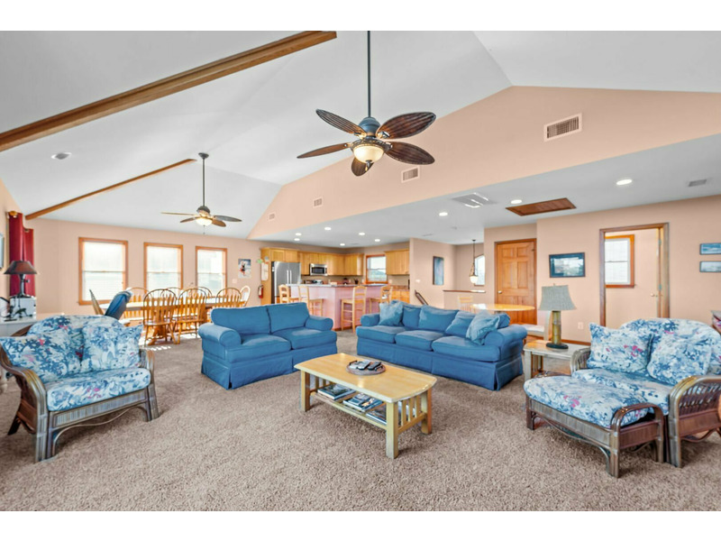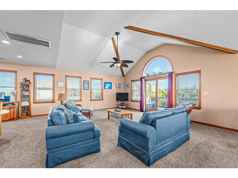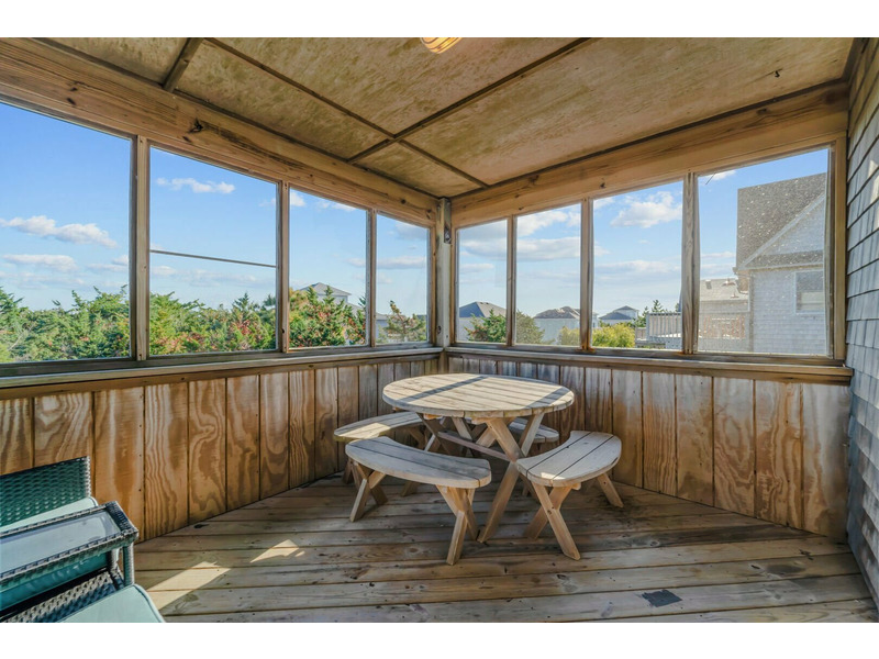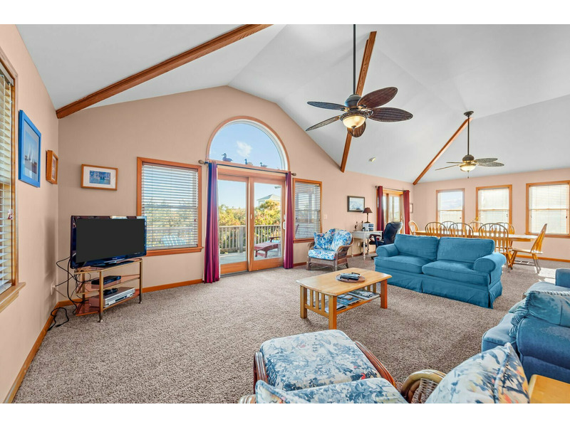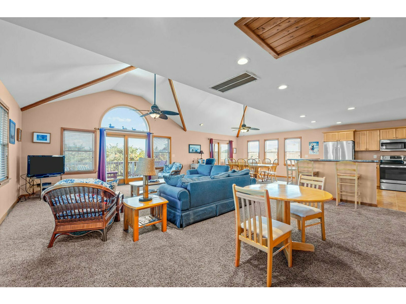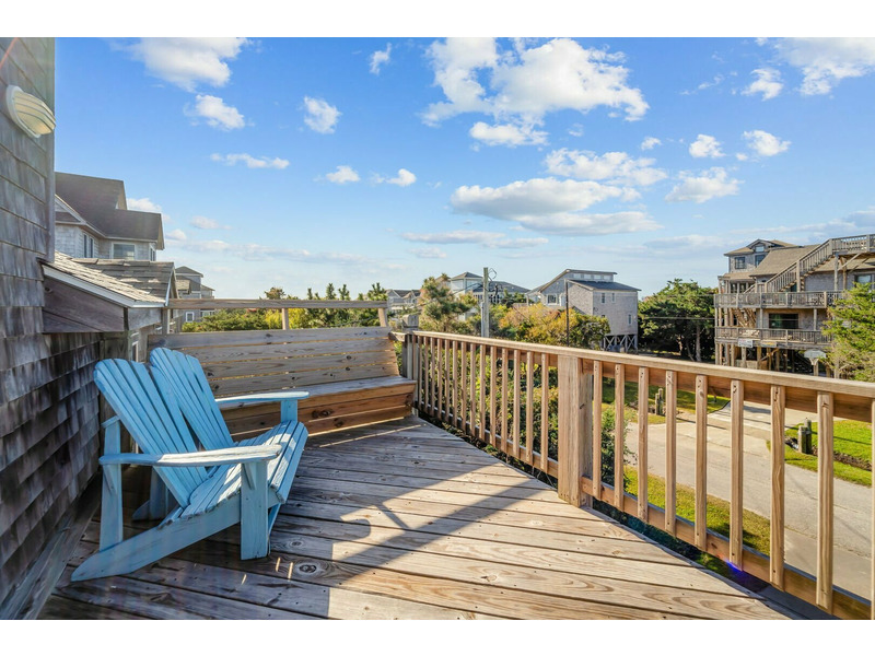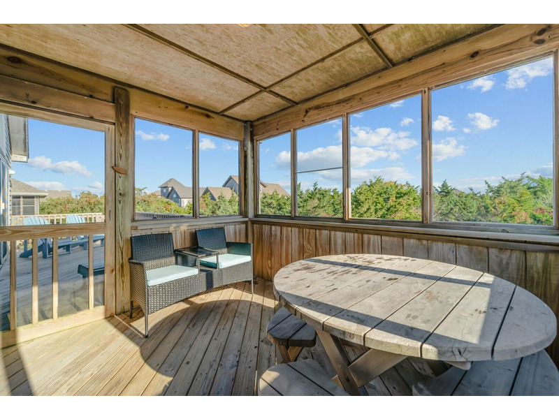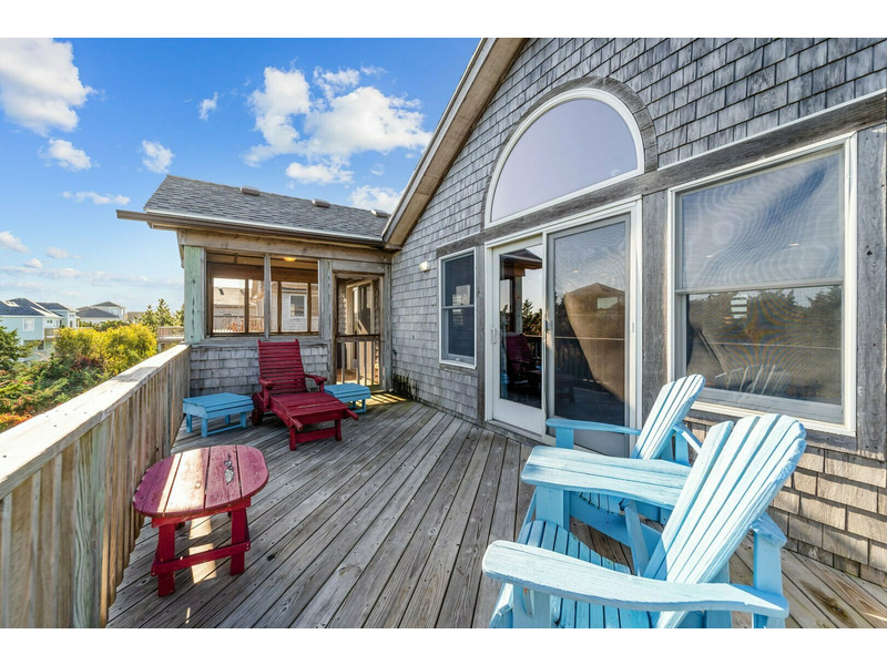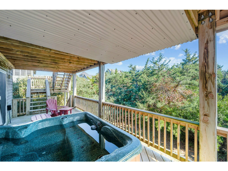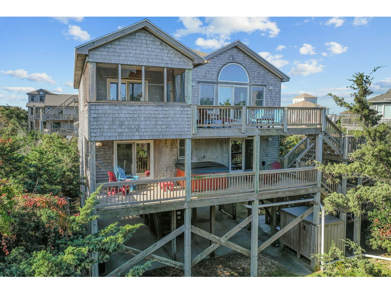 Inside Royal-T, you'll find the top floor great room; complete with a large dining room with table for 12, well-equipped kitchen and half bath. The living area features a flat screen TV, ample seating, and DVDs and books! There are multiple decks and a screened porch for watching sunrises, sunsets, moonlit waves, or just enjoying the cool ocean breeze. The bottom floor offers 2 Queen master bedrooms, each with sliding glass doors that access the covered deck. There, you can relax in the 6 person hot tub or on the deck furniture. Also located on this floor is a bedroom with 2 bunk sets, a bedroom with a pyramid bunk, a full bathroom, and laundry room. Royal-T has everything you need to enjoy your next Outer Banks vacation so book your stay now!