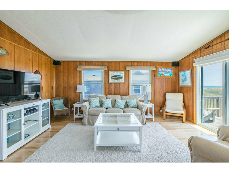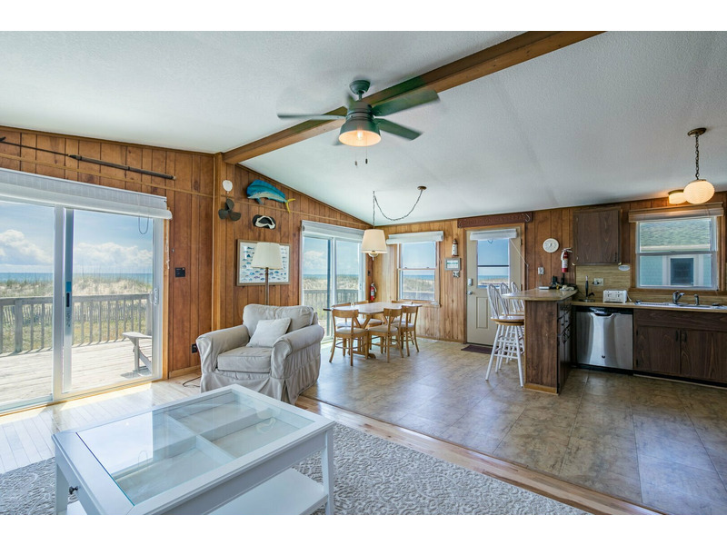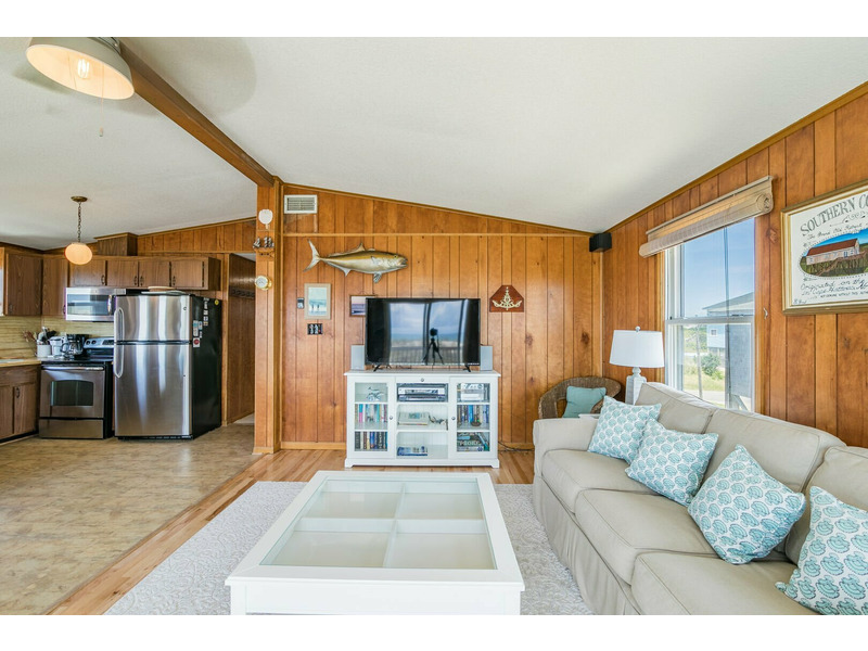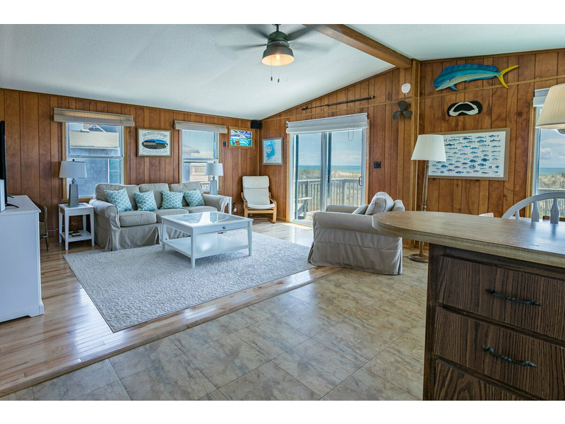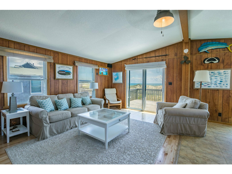 Inside this classic beach box, you'll find an open and spacious living room complete with beachy decor and stunning views of the ocean. The couch is the perfect place to veg out after a long day on the beach. Catch a movie or your favorite show on the flat screen TV or grab a book to divulge in from the library. The kitchen features stainless steel appliances and is fully equipped with everything you need to prepare meals during your stay. With 3 bedrooms, and one featuring 2 twin beds, there’s plenty of room for everyone at Southern Comfort. This Outer Banks vacation home has everything you need and so much more for the perfect beach vacation. Book your stay at Southern Comfort today!