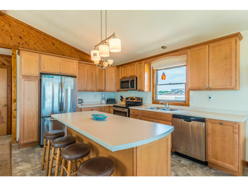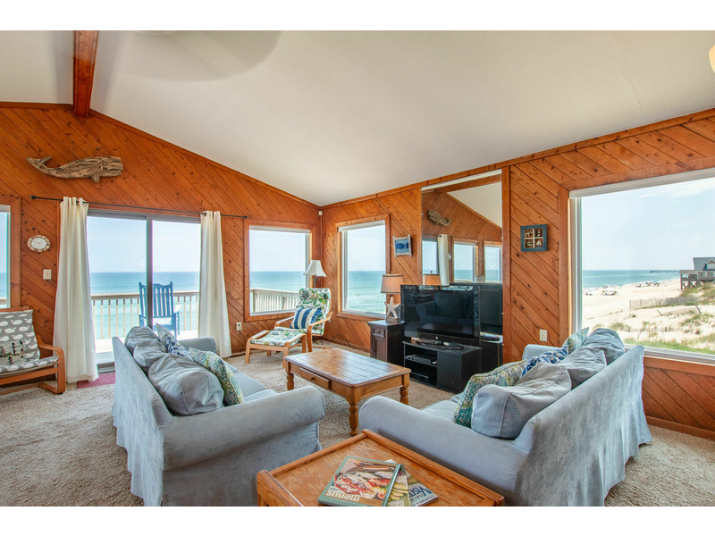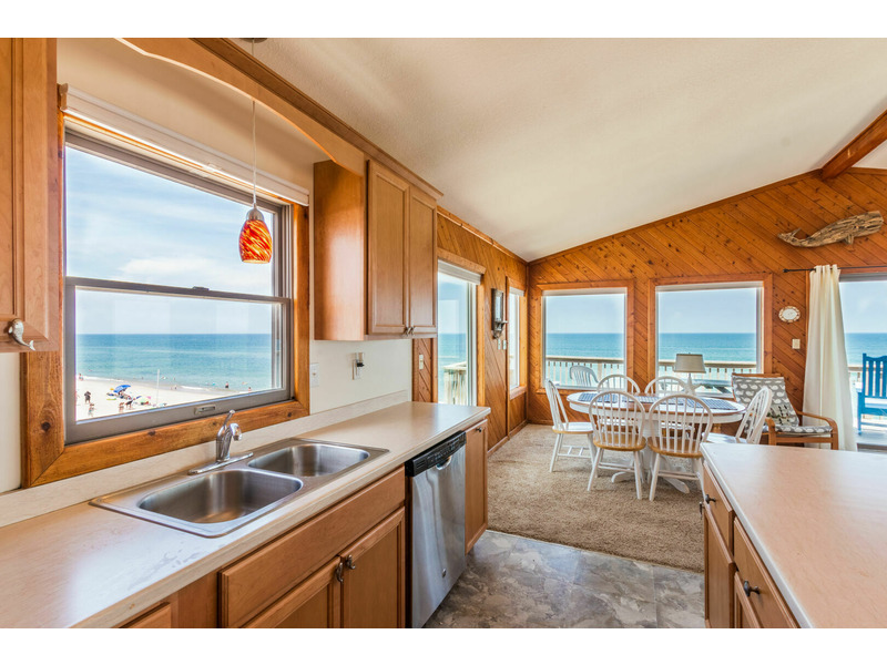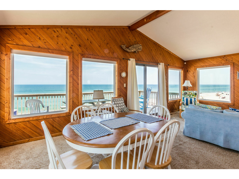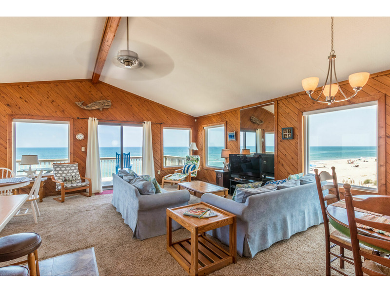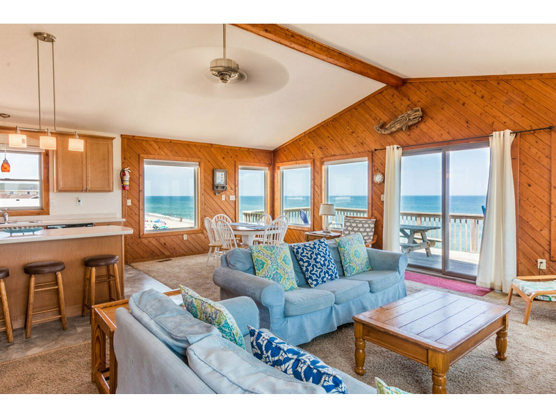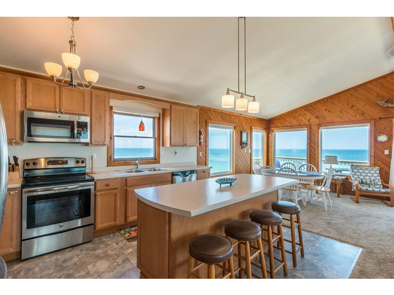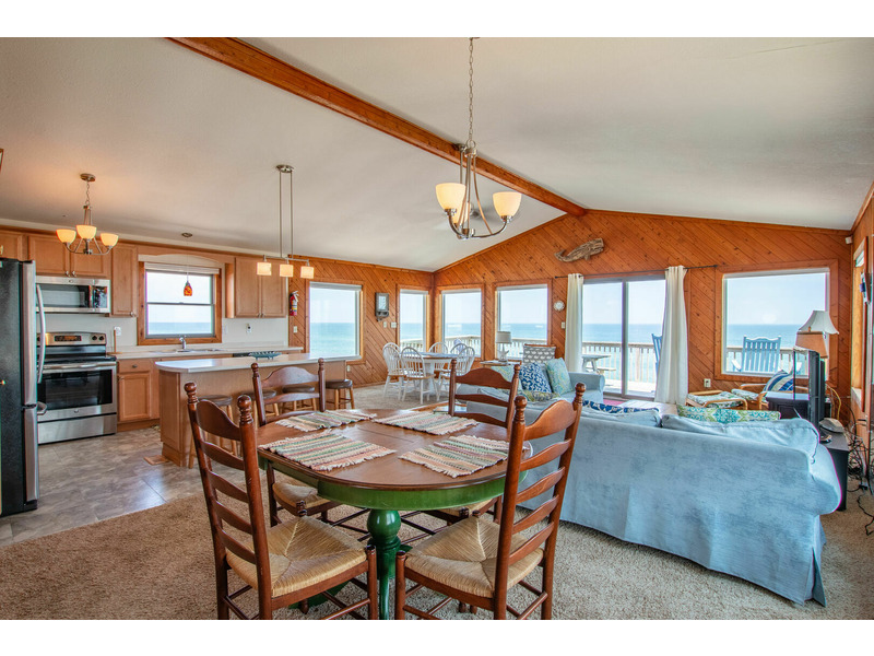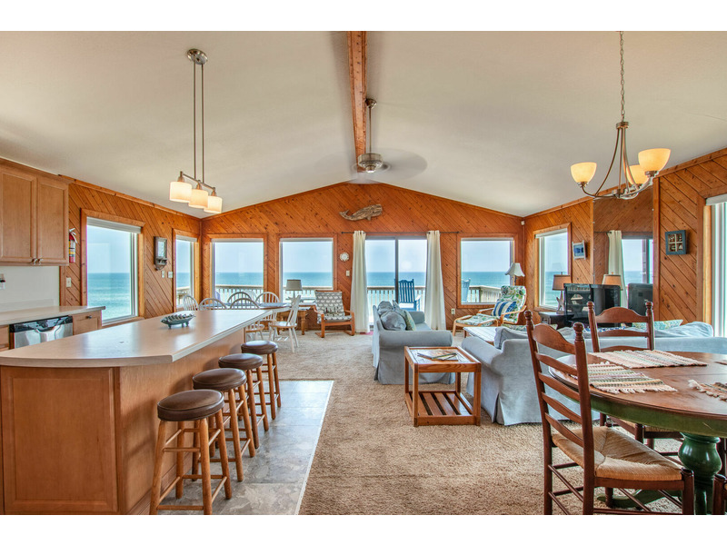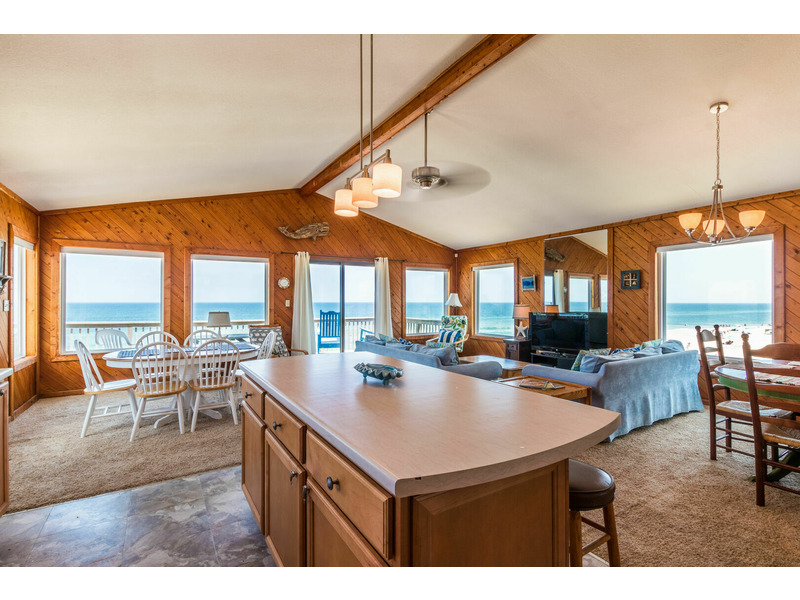 Living Room, 2 Dining areas, Kitchen with Island and Bar Seating, Half Bath, Oceanfront Deck.