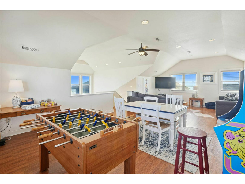 Great Room Living Area and TV, Game area with Foosball Table and Ms. Pacman Mini Arcade Game, Desk.