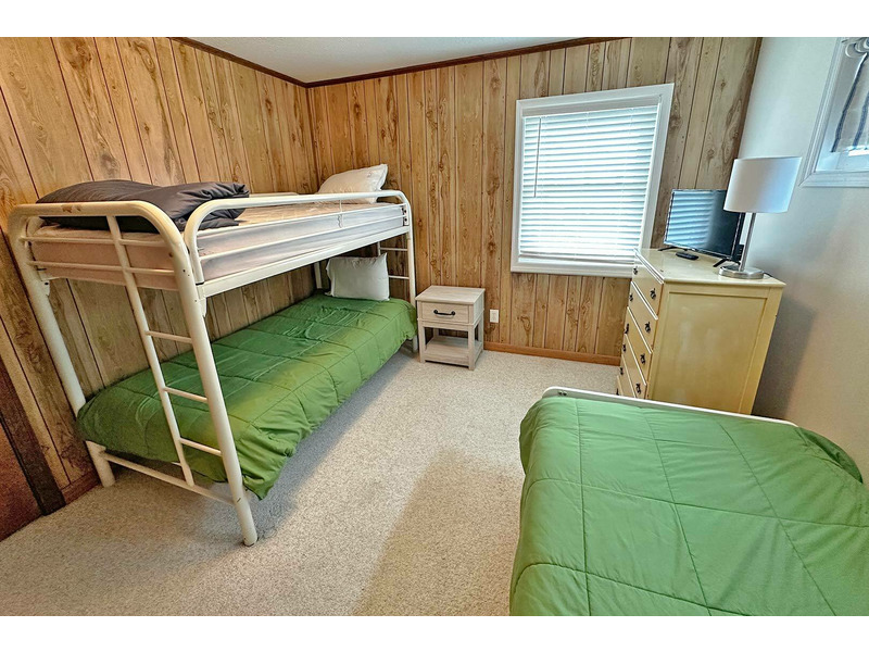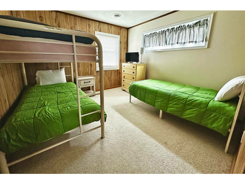 Living Room with TV, Kitchen, Dining Area, Queen Master Bedroom with TV, Queen Bedroom with TV, Bedroom with 1 Bunk Bed and 1 twin bed, Full Hall Bath.