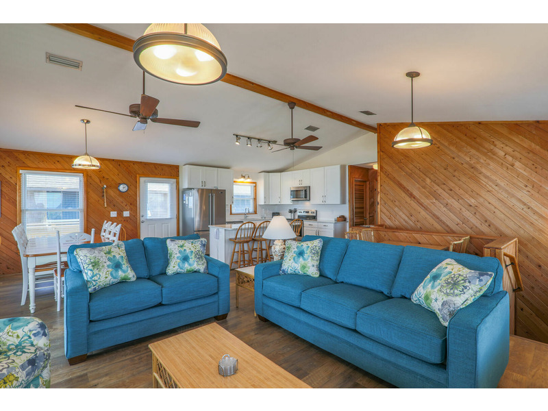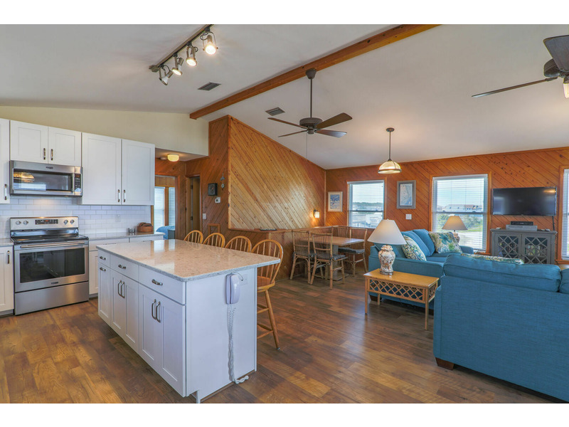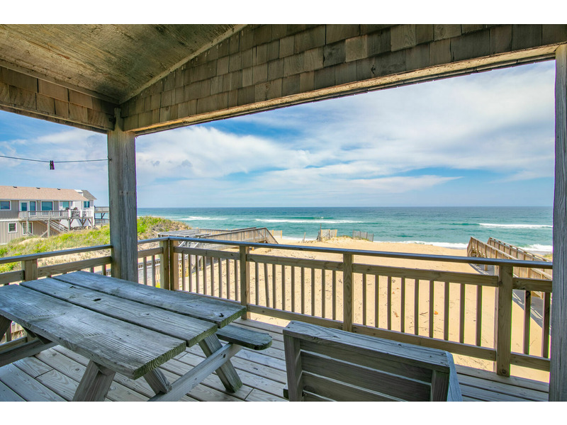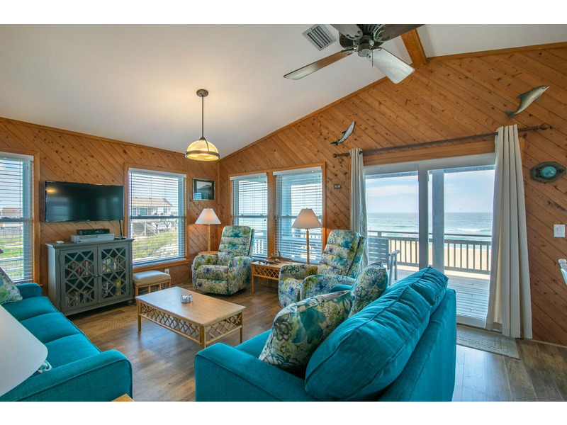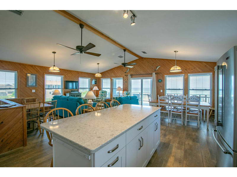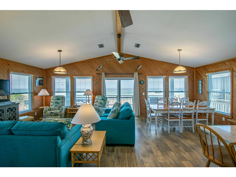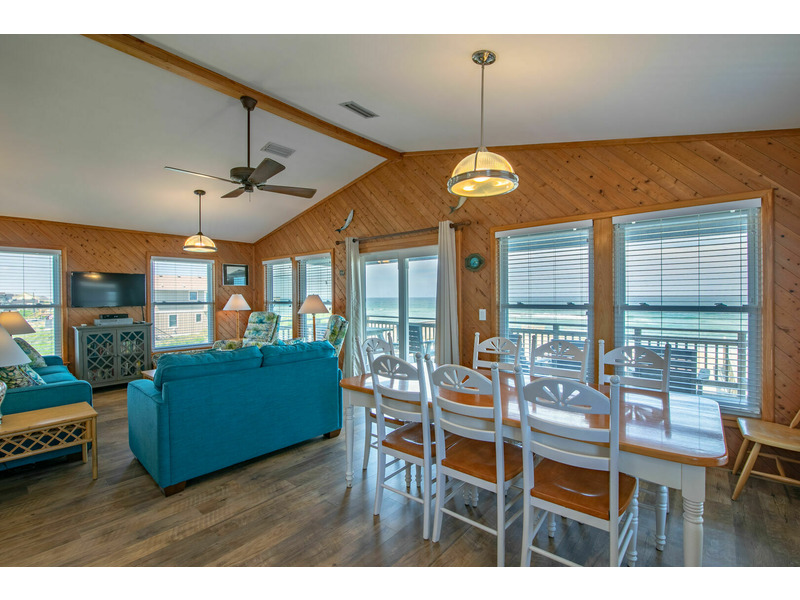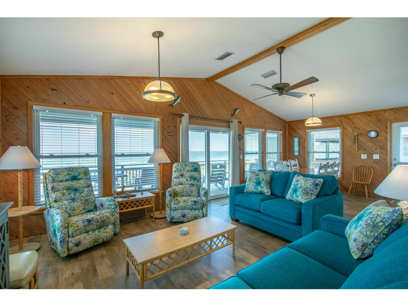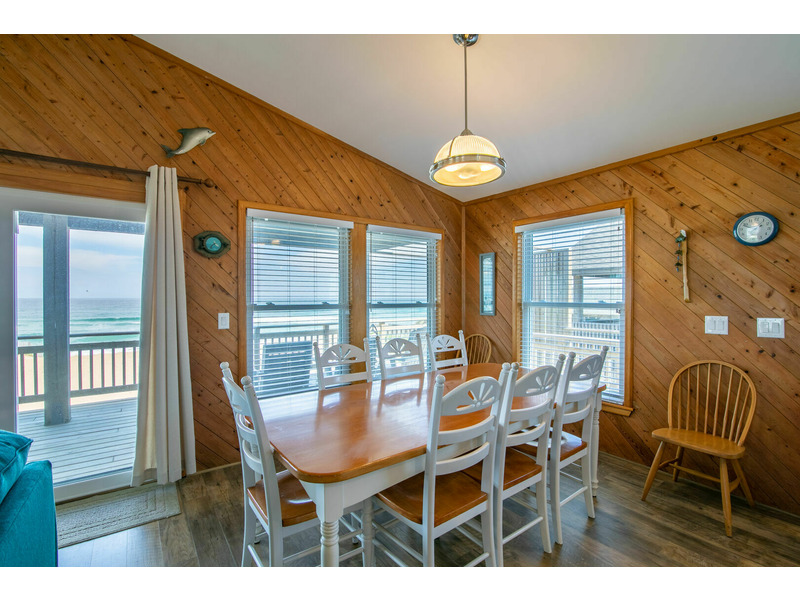 Top level has living room, dining area, and kitchen with access to oceanfront, south and west connecting decks. Outside stairs leading to walkway to the beach and the entry level.  Cable TV, DVD, and VCR. Master bedroom with deck access is also on the top level.