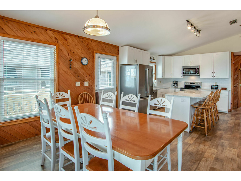 5 bedrooms and 3 bathrooms. King master with deck access on top level. 2 bedrooms with queens and 2 bedrooms with 2 twins each on level below, along with 2 full baths and access to east and west facing decks. All bedrooms have cable TVs and ceiling fans..