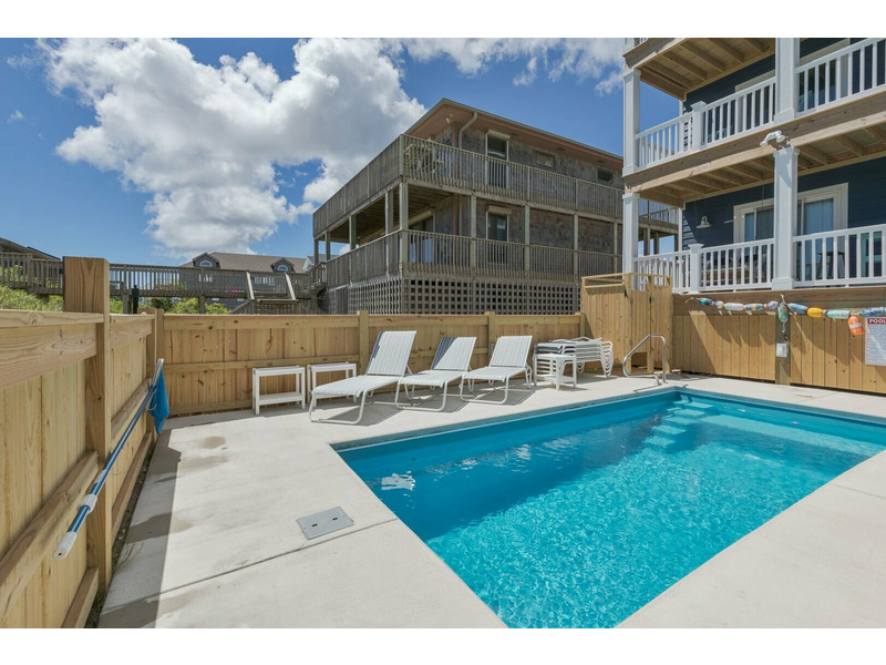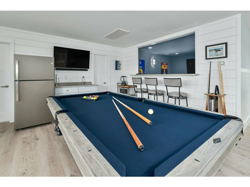 Rec Room with Pool Table, and Arcade Game, Bar/Kitchenette, and TV, Custom Theater Room, Pool/Oceanside Queen Bedroom with Deck Access, Soundside Queen Master Bedroom, Full Bath, Elevator Access, Access to Pool area with Hot Tub, Poolside Cabana with TV.