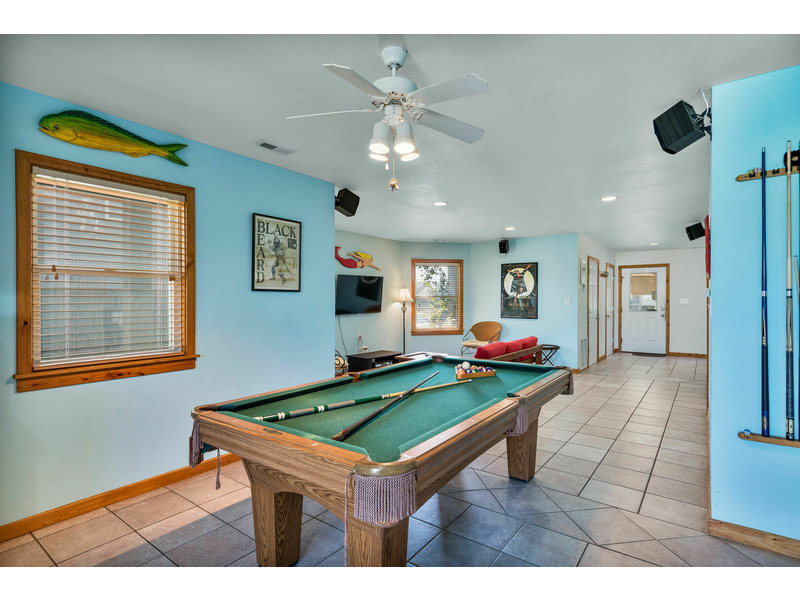 Rec Room with Pool Table, TV and Wet Bar with Full-Size Fridge, Master Bedroom with Queen, Twin, and TV, Half Bathroom.