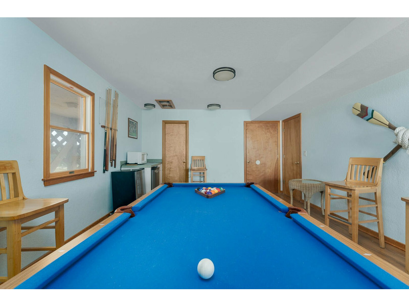 Rec Room with TV, Pool Table, Wet Bar, Mini Fridge, Microwave, Laundry Area, Half Bathroom.