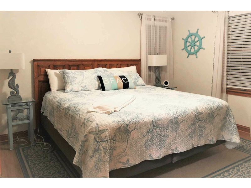 King Master Bedroom with TV, DVD Player, and Deck Access.