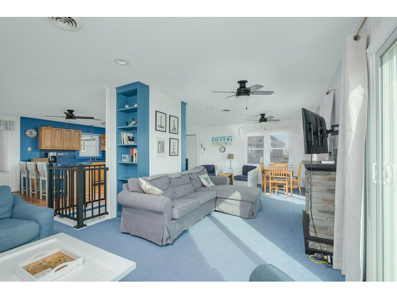 Living Area with TV and Electric Fireplace, Dining Area, Kitchen, Half Bathroom.