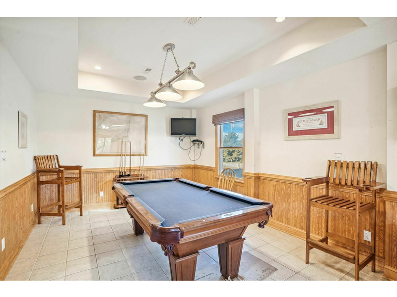 Rec Room with Pool Table and 2 TVs, Kitchenette with Full-Size Refrigerator, Bedroom with Pyramid Bunk Bed, Full Bathroom.