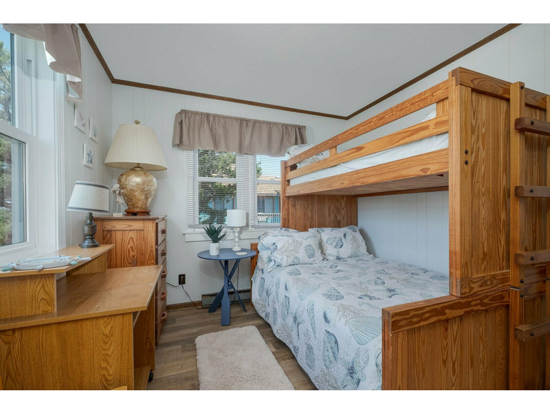 Living Area with Smart TV and Deck Access, Dining Area, Kitchen, Queen with Attached Half Bathroom, Bedroom with Pyramid Bunk, Full Bathroom.