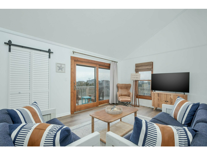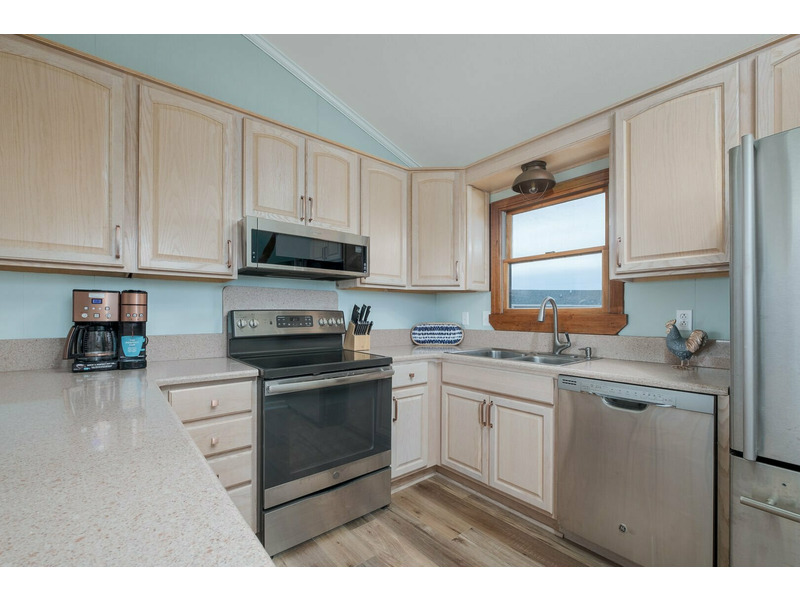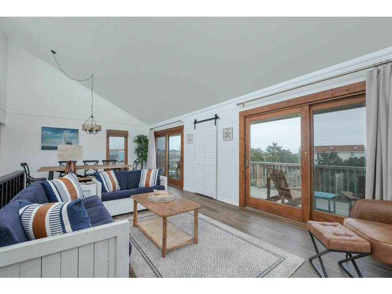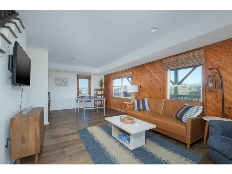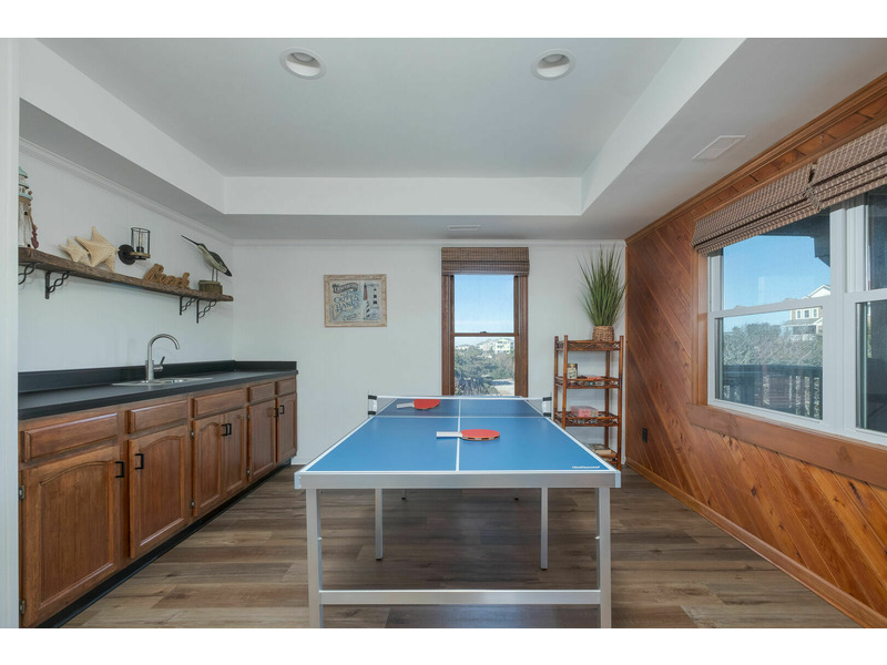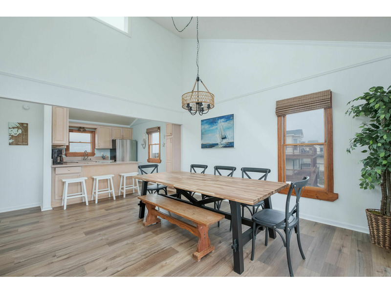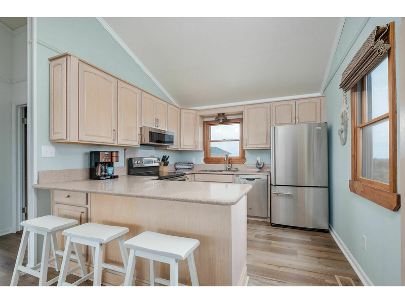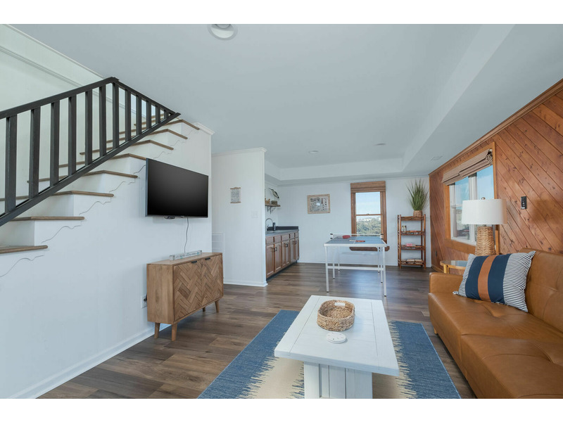 Upstairs at this Outer Banks rental, you'll be welcomed by an open living area complete with comfy seating and a flat-screen TV. It's the perfect place to gather with friends and family to unwind and relax. The upstairs level is also home to the kitchen where you can easily prepare meals during your stay. Spacious countertops and stainless steel appliances will be sure to delight the chef in your crew. With breakfast bar seating for 3 and dining room table for 8, there's plenty of room for everyone to sit and gather around a homecooked meal. When it's time for bed, you can head to one of the 3 beach-inspired bedrooms for some much-deserved rest. A Sailors View also features an additional seating area complete with a flat-screen TV and wet bar with a card table. Grab one of the board or card games from the shelf and engage in some friendly competition with your friends and family! A Sailors View truly has everything you need for a memorable OBX vacation.