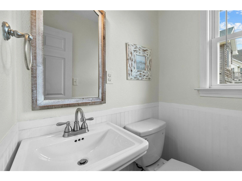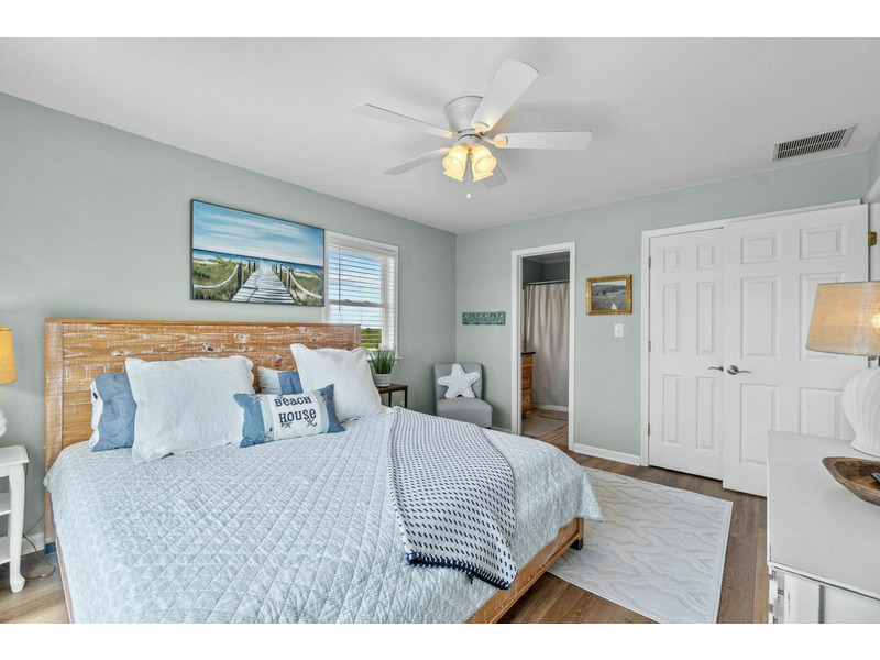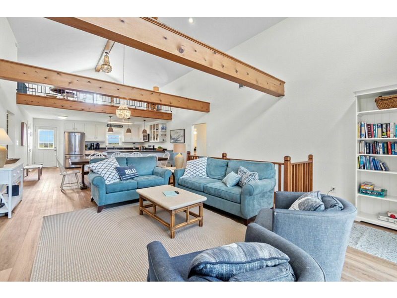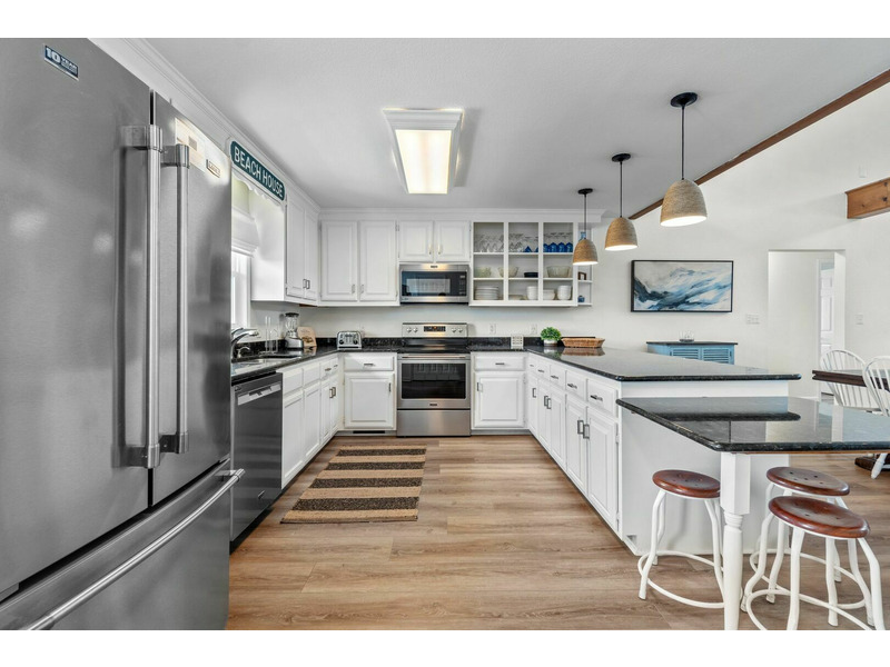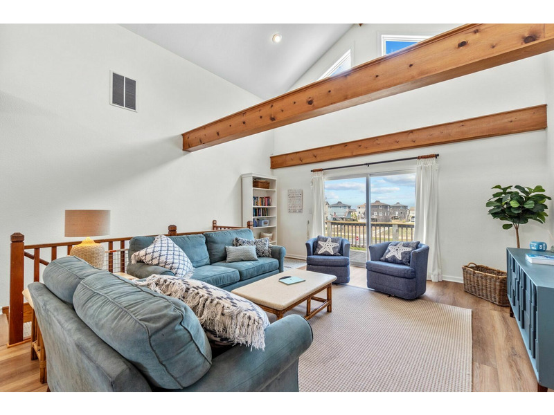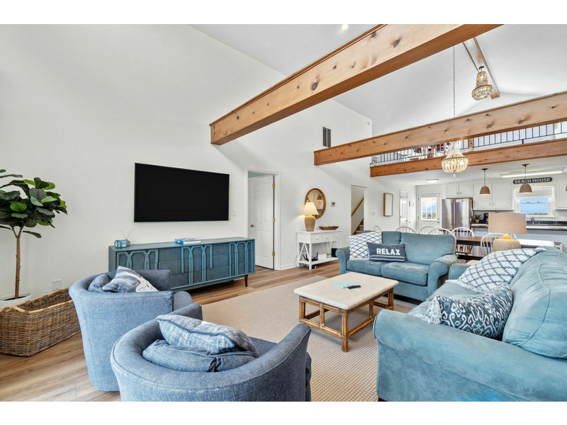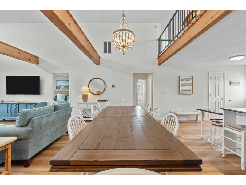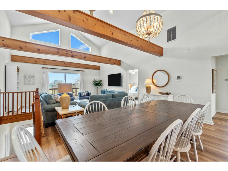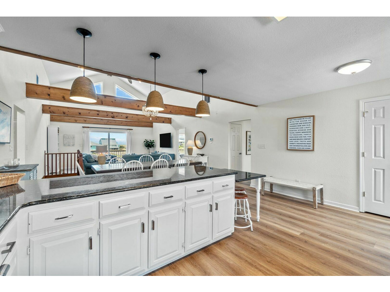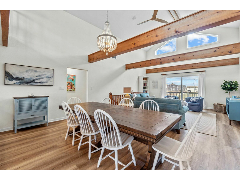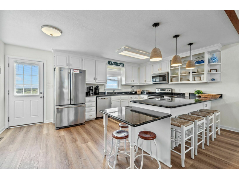 Inside this Nags Head rental, you're greeted by a bright and airy living area adorned with coastal decor. Lounge on one of the plush couches, catch a movie on the flat-screen TV, or catch up with friends and family. The open-concept layout seamlessly connects the living, dining, and kitchen areas, providing the perfect setting for gatherings and shared memories. The fully-equipped kitchen has everything you need to whip up delicious meals for your loved ones including stainless steel appliances and ample counterspace. The kitchen island features seating for 7 and the dining room table seats 8 so everyone can enjoy meals together. With 7 well-appointed bedrooms, Free Bird can comfortably accommodate your entire crew, providing privacy and comfort for everyone. Fall asleep to the gentle sound of ocean waves and wake up refreshed and rejuvenated for another day in paradise. Free Bird has everything you need for an unforgettable Outer Banks vacation.