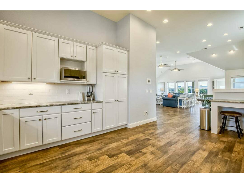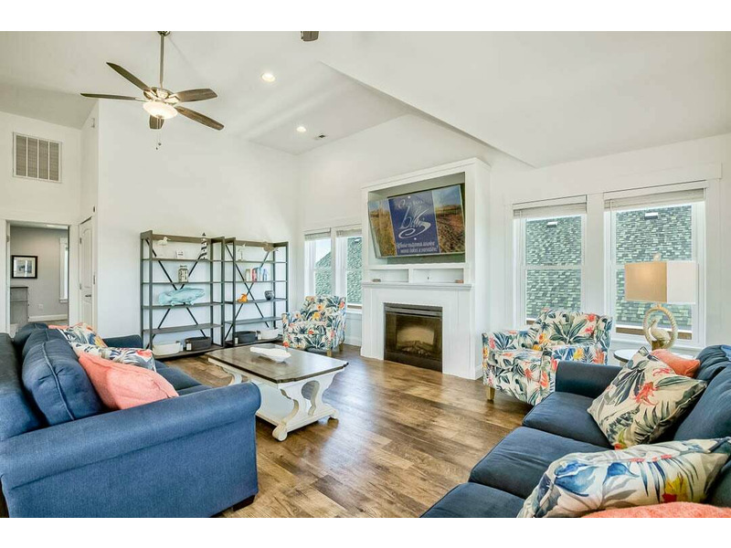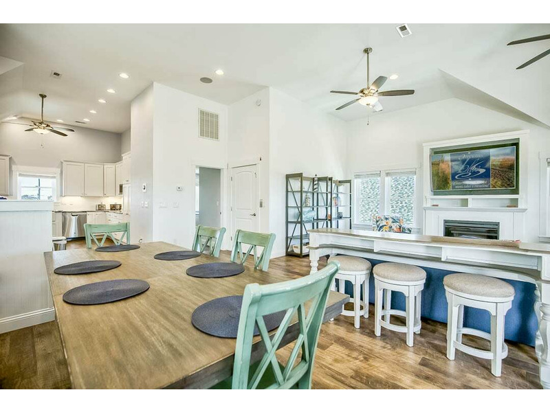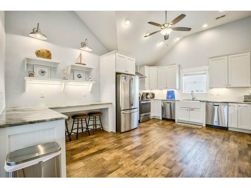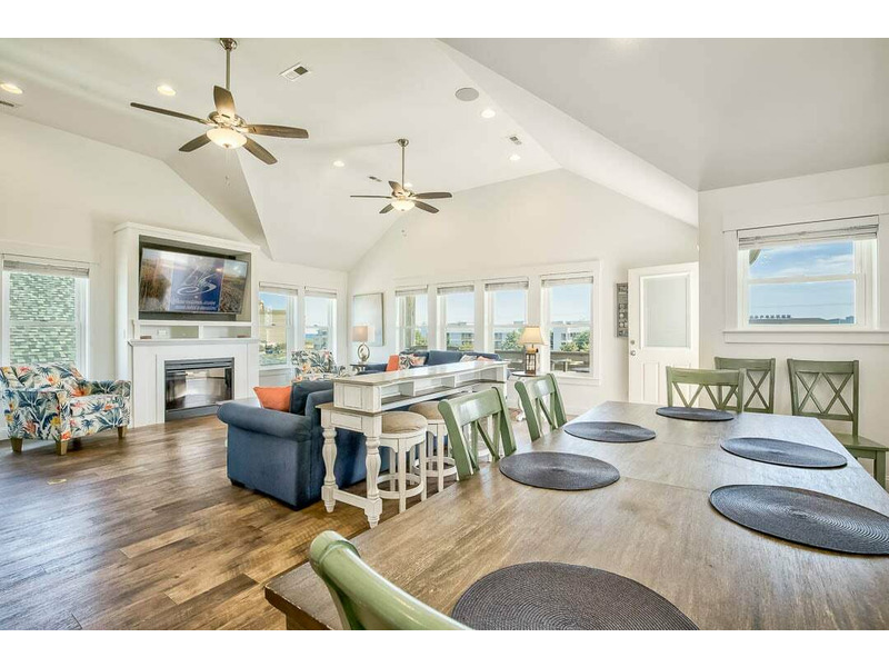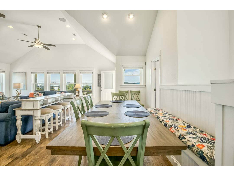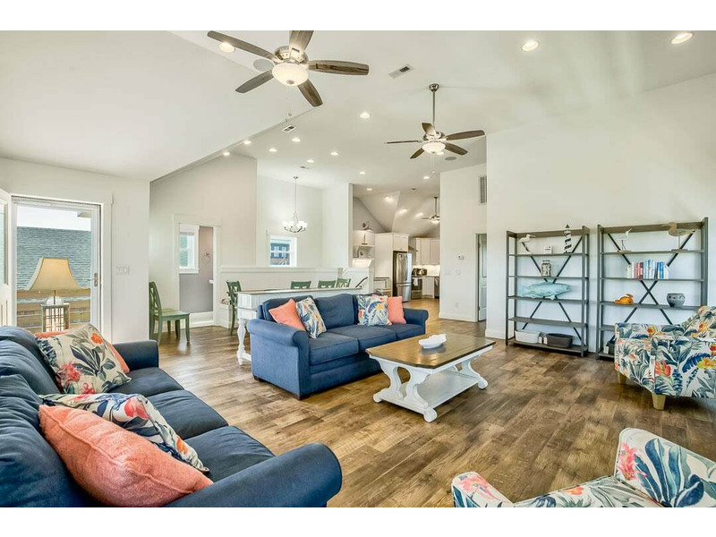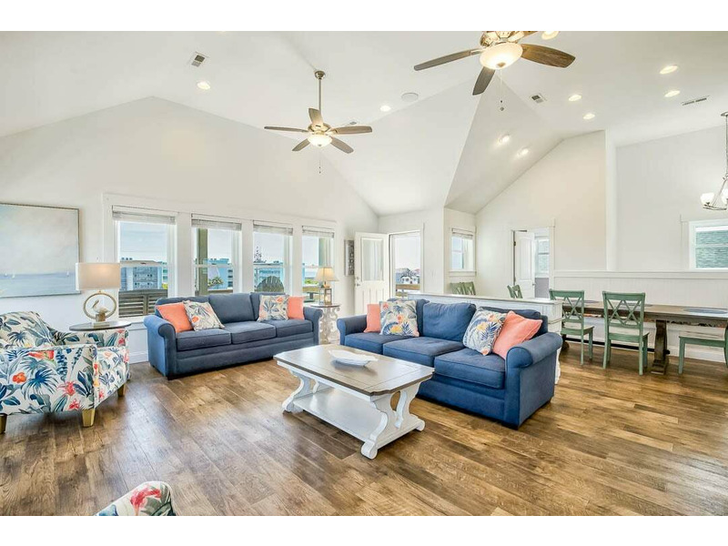 Inside, this five-bedroom, tri-level home has been recently updated with vibrant coastal décor and quality furnishings that make it feel like home—but with a little more sunshine. The kitchen is spacious and fully stocked with stainless steel appliances—ready for a seafood boil or a pancake breakfast before the beach. There's plenty of room to gather around the dining table or kick back in the living room, and the downstairs rec room is a favorite for movie nights, ping pong tournaments, and late-night snacks from the kitchenette. All top and mid-level bedrooms have an attached private bathroom for your comfort and convenience.