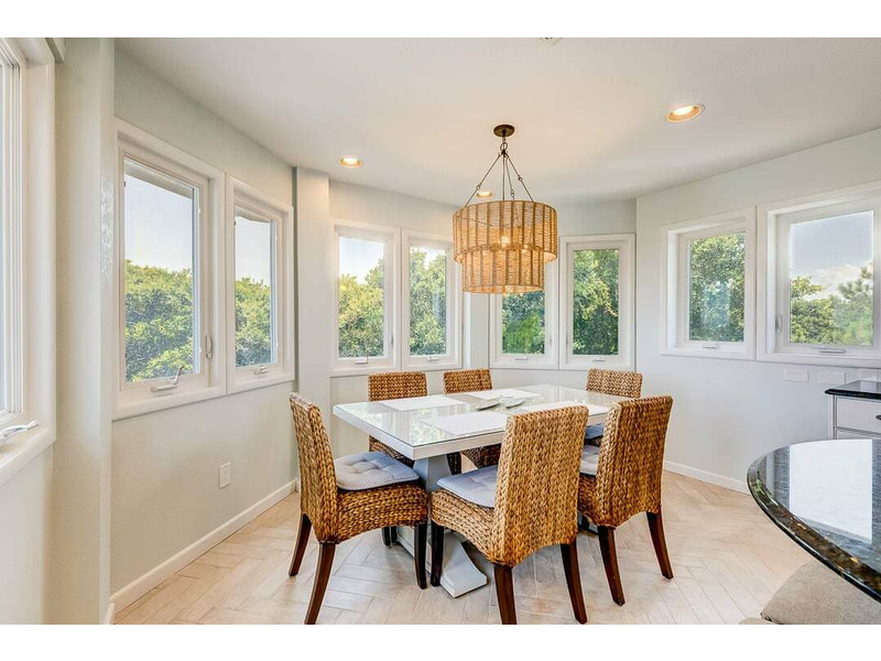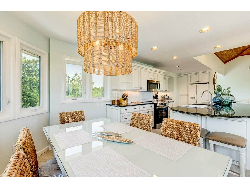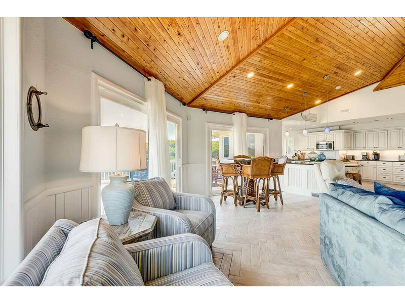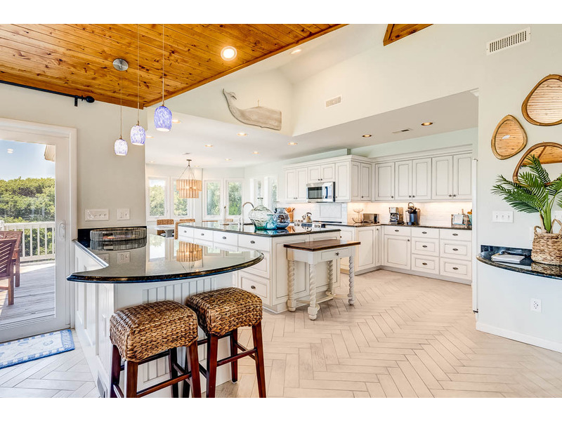 Inside, the top floor charms with vaulted ceilings, a light-filled living area, and a great view. A well-appointed kitchen—complete with a large island, built-in beverage cooler, and two dining options—makes it easy to feed a crowd. One queen bedroom on this level adds an extra spot for guests.