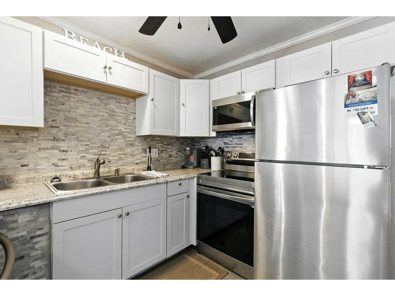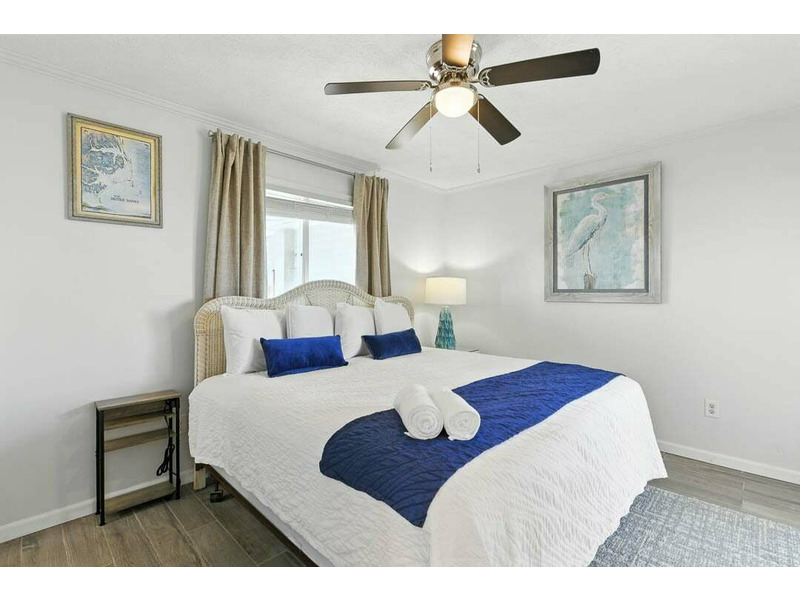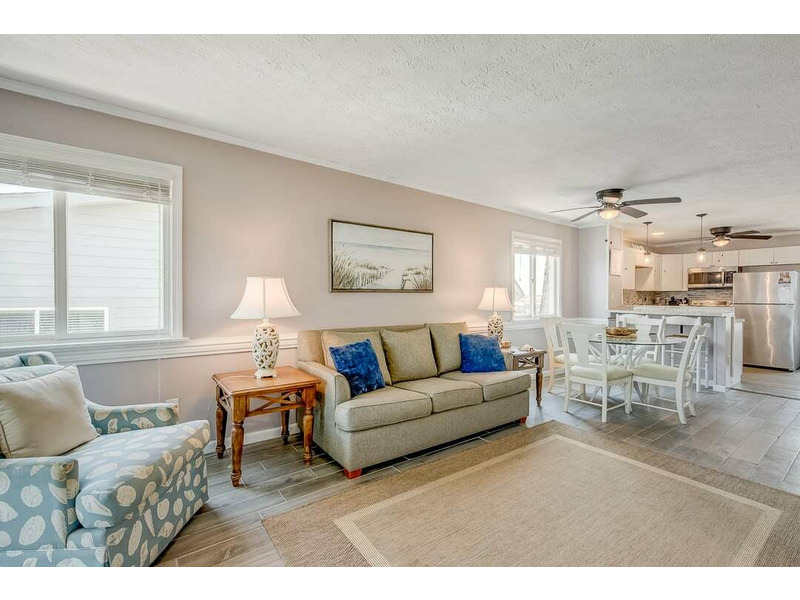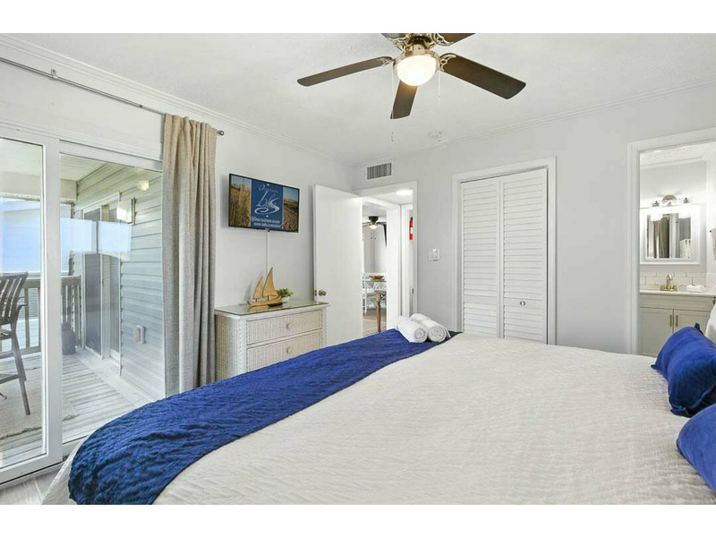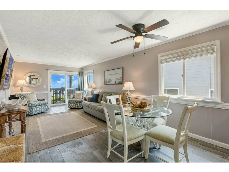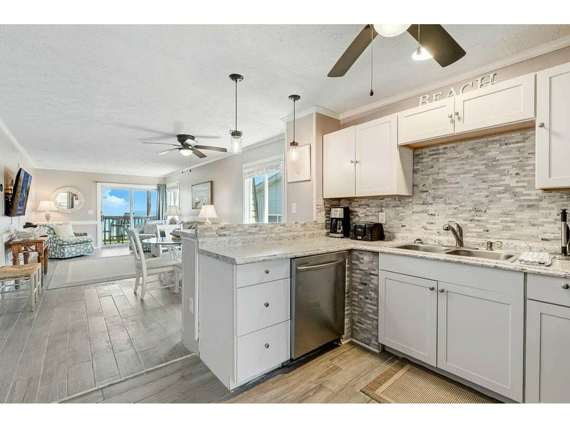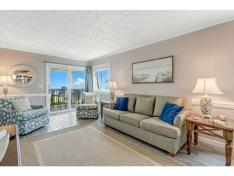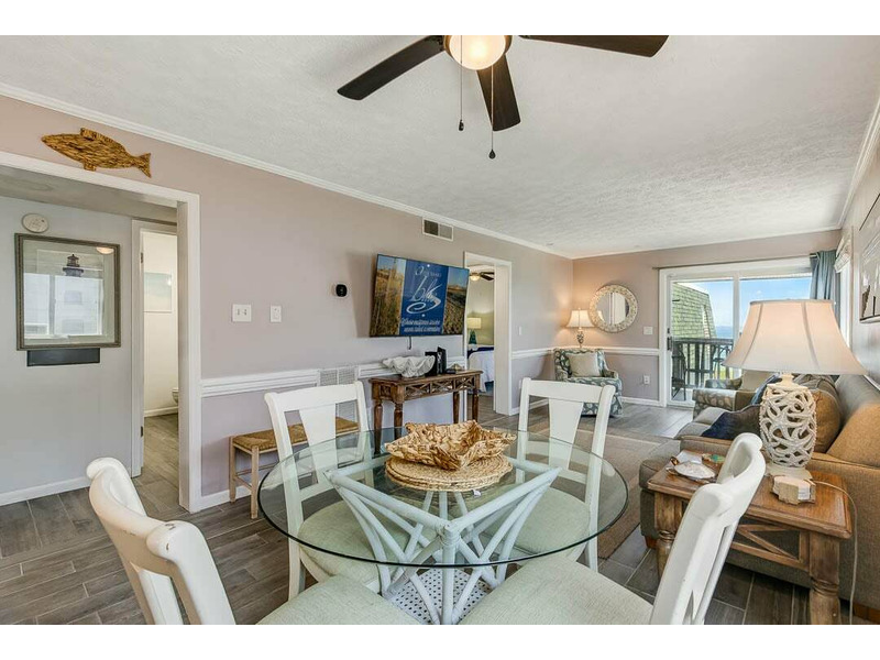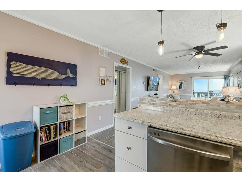 The oceanfront king bedroom is a true retreat, with deck access and an en suite bathroom. A second bedroom with two twin beds is perfect for kids or extra guests and shares a hall bath with a double vanity and tub/shower combo. The condo is tastefully decorated with updated furnishings and coastal touches throughout, making it feel like your personal getaway from the everyday.
