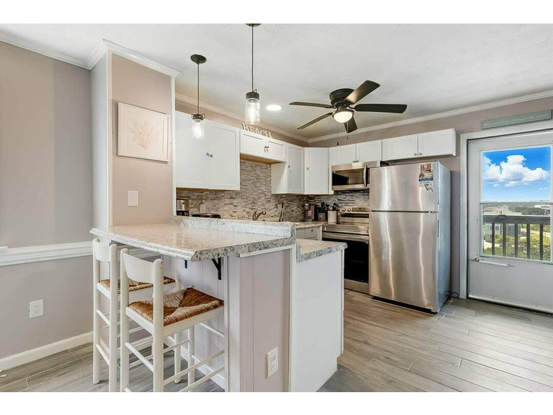Step inside and you're immediately greeted by an inviting view of the Atlantic. The open living space includes a cozy sitting area, dining for four, a convenient bar with additional seating, and a modern kitchen outfitted with stainless steel appliances and a stylish tile backsplash. Step through the sliding doors onto the private, covered balcony for front-row views of the Atlantic—ideal for morning coffee, quiet afternoons, or winding down after a day at the beach.