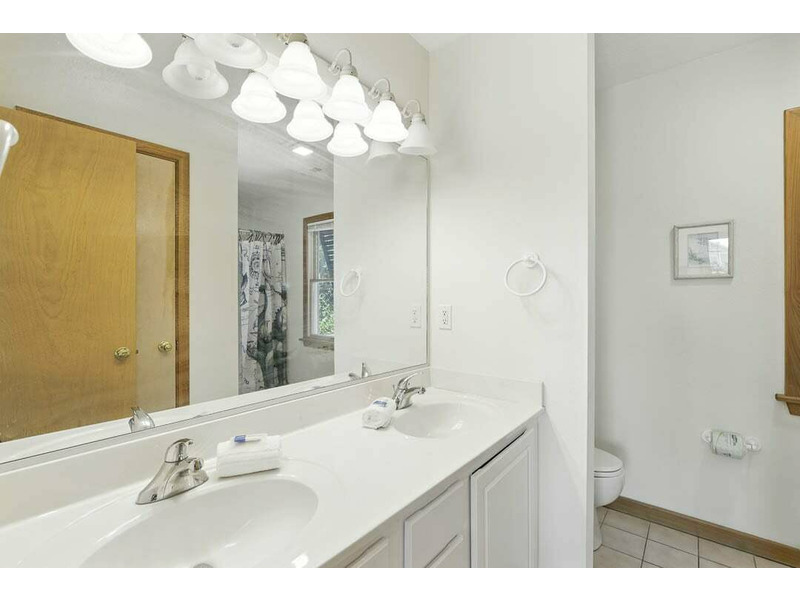 Top-Level: Living Room with 75" Smart TV, Additional Table (seats 4), and Deck Access; Dining Room with Table (seats 10), and Deck Access; Kitchen with Bar (seats 4), Blender, Coffee Maker (Drip & Keurig), Dishwasher, Microwave, Oven/Stove, Refrigerator, Toaster, Pots, Pans, Dishes, and Cooking Essentials; King Master Bedroom with TV, Deck Access, and Attached Full Bathroom with 2 Sink Vanity; Hall Half Bathroom.